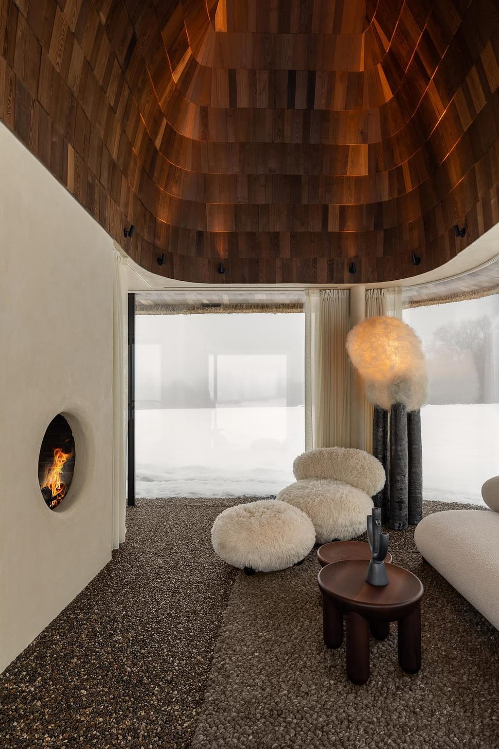 Each guesthouse is organized around a central concrete core containing bathrooms and services. Living and sleeping areas are arranged on either side of the core. The living spaces include a minimalist fireplace intended as a contemporary interpretation of the traditional Ukrainian stove. The design intentionally excludes televisions, emphasizing visual engagement with fire and landscape.