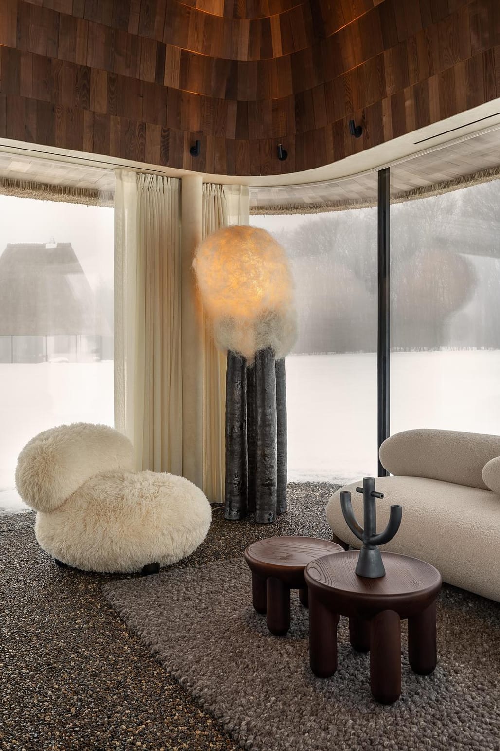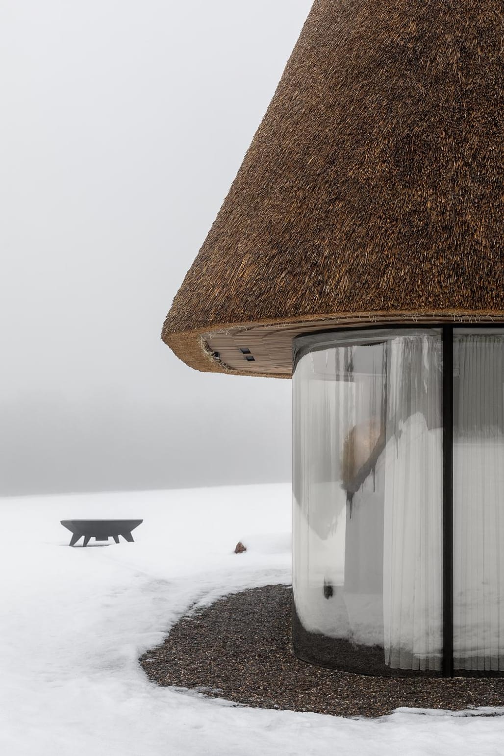 The design draws on characteristics of the historic mazanka, a rural housing type defined by whitewashed walls, thick envelopes, and thatched roofing. In the contemporary version, the elements are translated into fully glazed facades and an oversized sculptural roof. The roof’s profile creates a distinctive silhouette intended to reference both traditional headwear and natural organic forms.