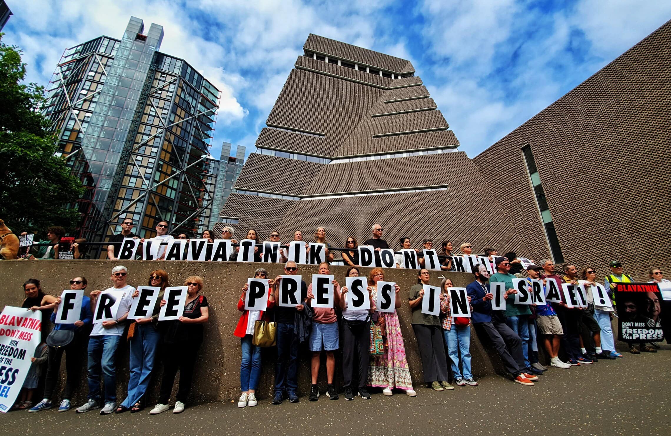 Protesters gather outside the Blavatnik Building at Tate Modern in London, accusing UK billionaire Len Blavatnik of cancelling TV programmes on Channel 13 in Israel which are critical of Prime Minister Benjamin Netanyahu, July 21, 2024 (Rotem Peri)