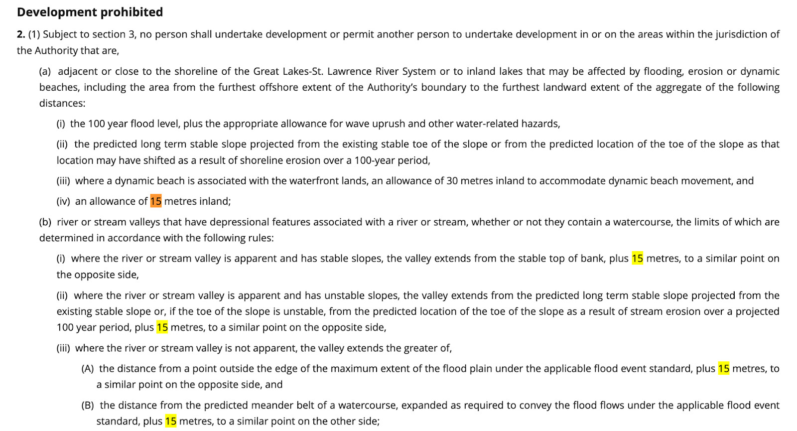 At the time the approvals were issued, development within river valleys under CVC’s jurisdiction was governed by Ontario Regulation 160/06, which required setbacks from the stable top of bank plus 15 metres. The regulation was revoked provincially on April 1, 2024.