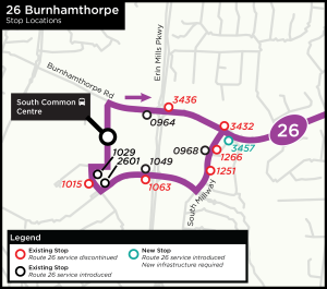 The routing for Route 26 Burnhamthorpe at and around South Common Centre will be revised. Route 26 Burnhamthorpe will now enter South Common Centre via South Millway and The Collegeway and exit the terminal via Burnhamthorpe Road. Passengers can board Route 26 Burnhamthorpe at South Common Centre at Platform A (stop #1099).