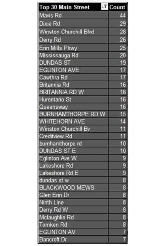 Dixie Road was second on the list with 29 citizen reports followed by Winston Churchill Boulevard with 28, Derry Road with 26 and Erin Mills Parkway with 25 to round out the top five (see top 30 chart below).