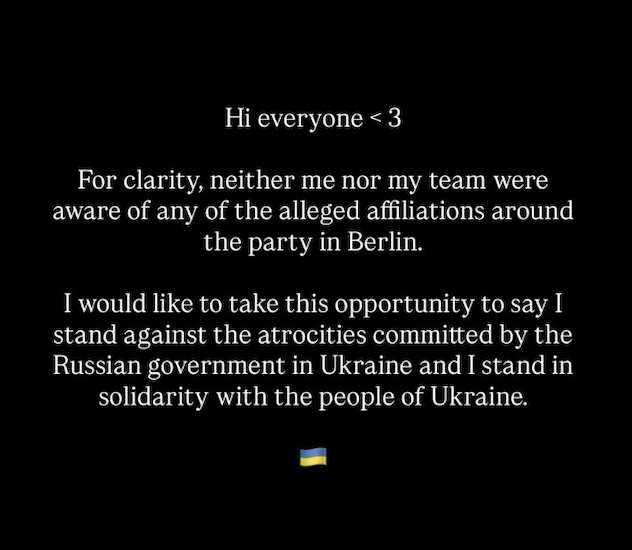 In a statement shared to Instagram Stories yesterday, February 19th, Charli XCX said neither she nor her team were aware of “any of the alleged affiliations around the party in Berlin,” and reiterated that she stands against actions by the Russian government in Ukraine and in solidarity with the Ukrainian people.