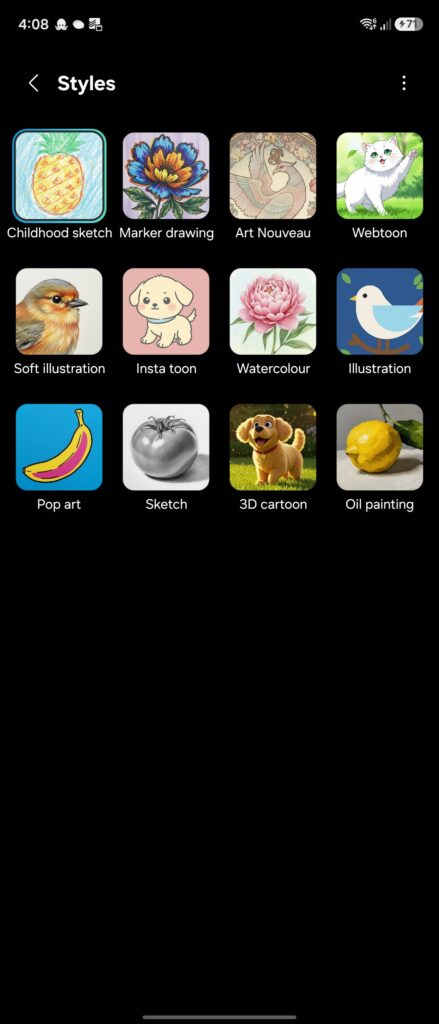 First, there’s a button to change the aspect ratio of the generated image. You can choose from several sizes, including 1:1, 4:3, 16:9, and their portrait equivalents. You can draw a sketch to prompt the AI, upload an image for reference, or tap the new Ideas button to get some inspiration. There are also two new styles you can apply to your creation: Marker drawing and Childhood sketch.