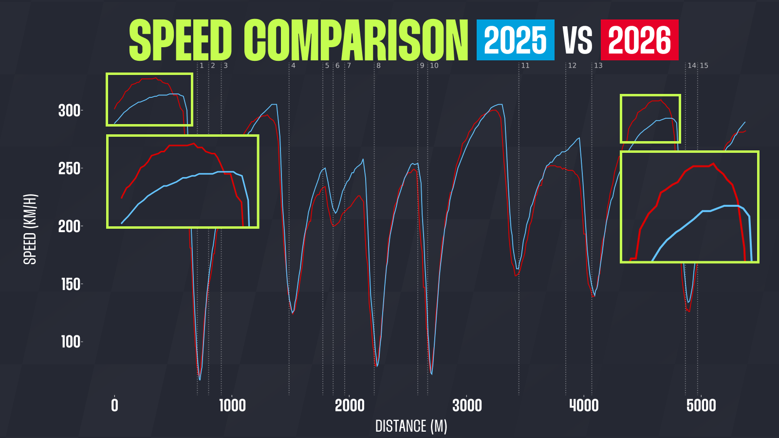 The 2026 car accelerates incredibly on the start-finish straight, while its top speed is also notably higher compared to the 2025 car. This is equally evident on the straight between Turns 13 and 14.