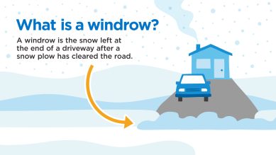 A windrow is a pile of snow that gets pushed onto a driveway by a plow as it clears the street. Residents with single, shared and double driveways will get at least a three-metre space cleared in their driveway windrow. No application or registration is required. The City will not clear windrows for condominiums, commercial properties and homes on private roads.