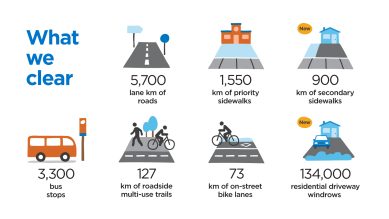 The City is responsible for clearing snow and ice from City-owned infrastructure. This includes roads, on-street bike lanes and cycle tracks, sidewalks, bus stops, pedestrian crossings, and roadside multi-use trails. Starting this winter, the City will also clear 134,000 residential driveway windrows.