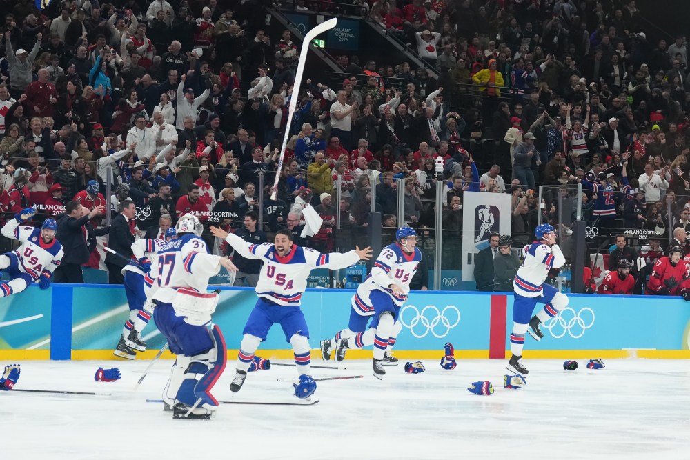 United States players celebrate their overtime win over Canada in the men’s gold medal hockey game at the 2026 Winter Olympics, in Milan, on Sunday, February 22, 2026. THE CANADIAN PRESS/Nathan Denette