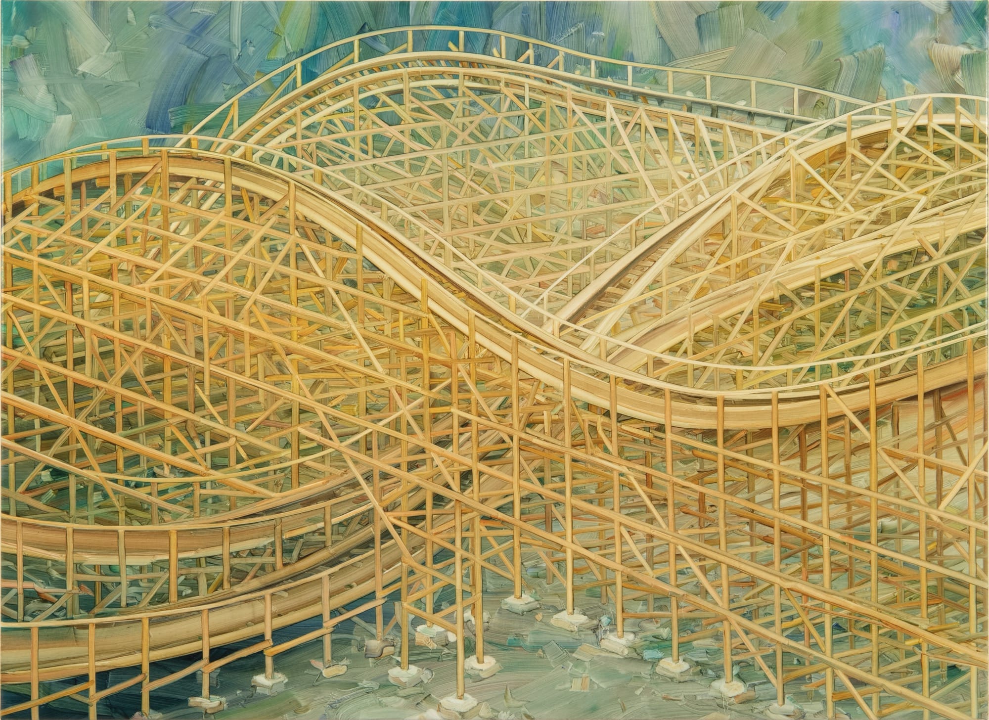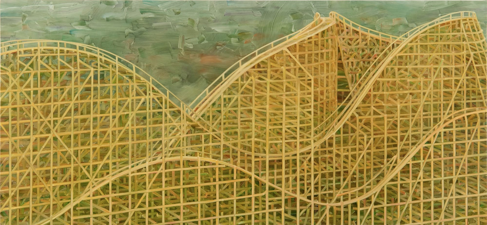 Devoid of the cars that roll along the tracks, Hutton focuses exclusively on volume, line, and three-dimensional grids, also typically setting the undulating forms against blank or brushy backgrounds so that even their scale is disorienting. While we typically associate the rides with youthful energy and nostalgia, the structures are strangely still and stark when pared down to their pure engineering.