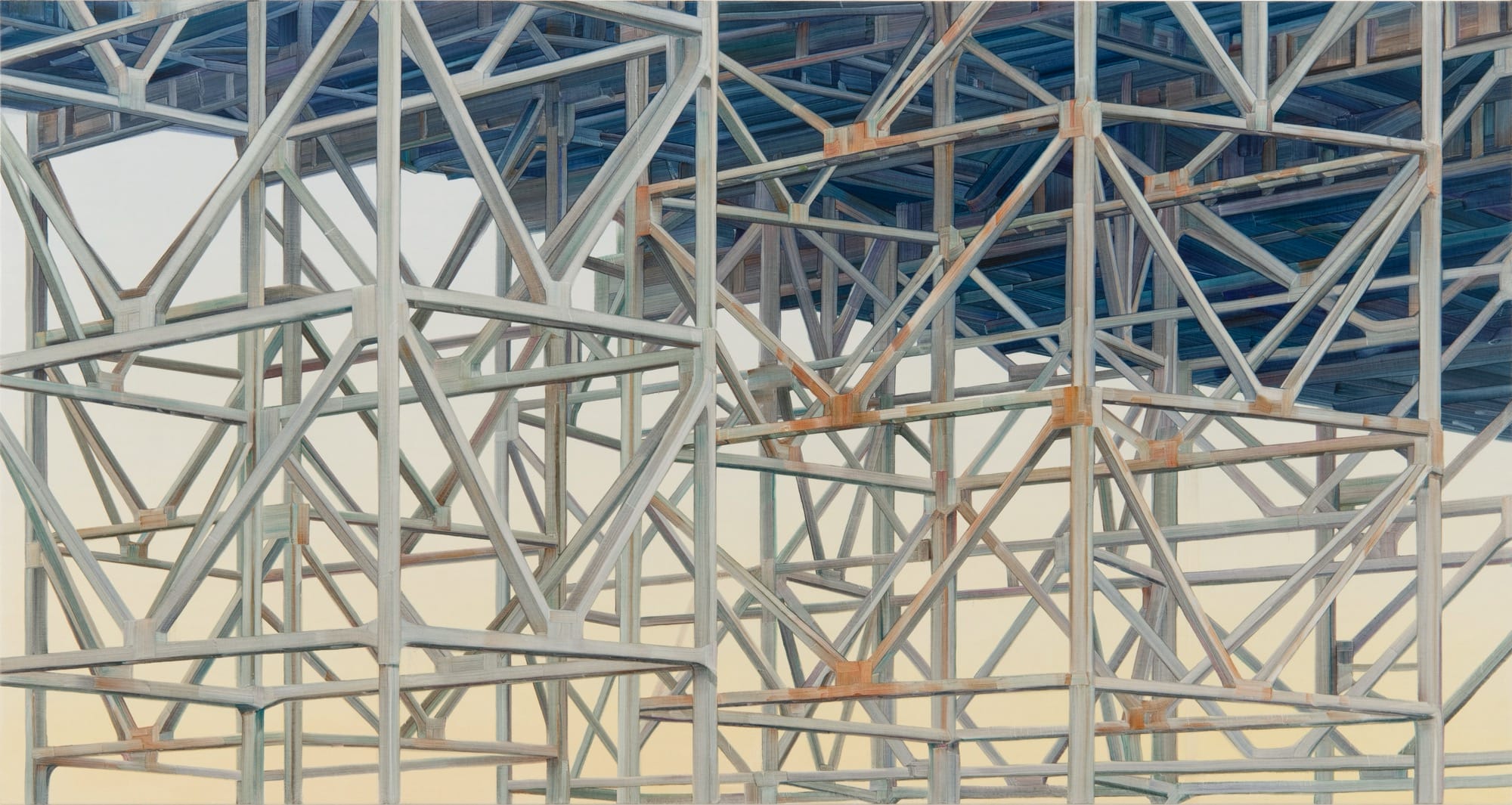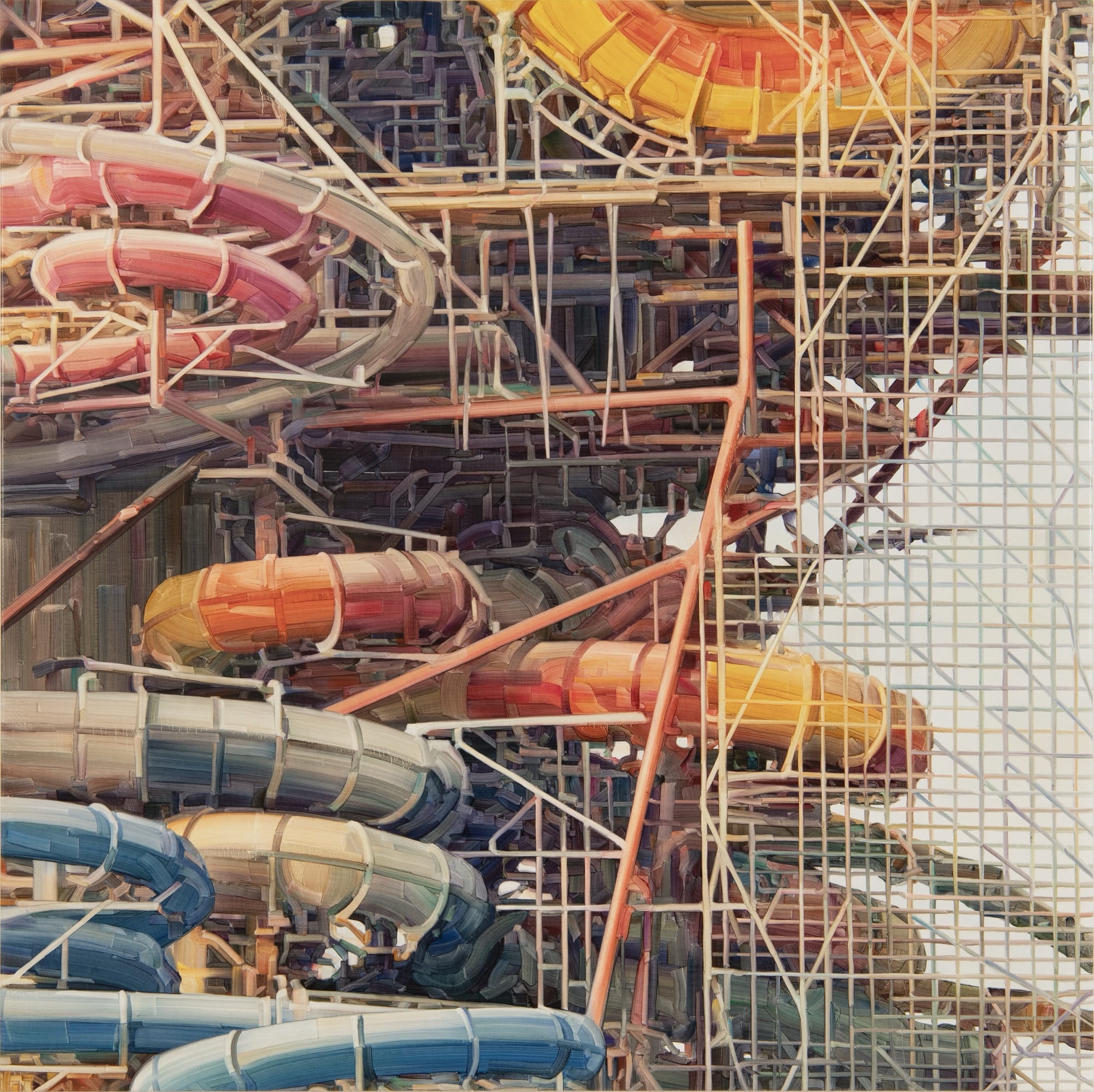 Considering Alex Hutton’s fascination with rollercoasters and monumental waterslides, he doesn’t actually ever climb aboard. “Heights and the sinking feeling during free-fall bother me too much to enjoy them,” he tells Colossal. In a way, that adds even further dimension to the enigmatic, unpeopled atmosphere of his meticulous oil paintings, which focus on rollercoasters, waterslides, and intricately contrived frameworks.