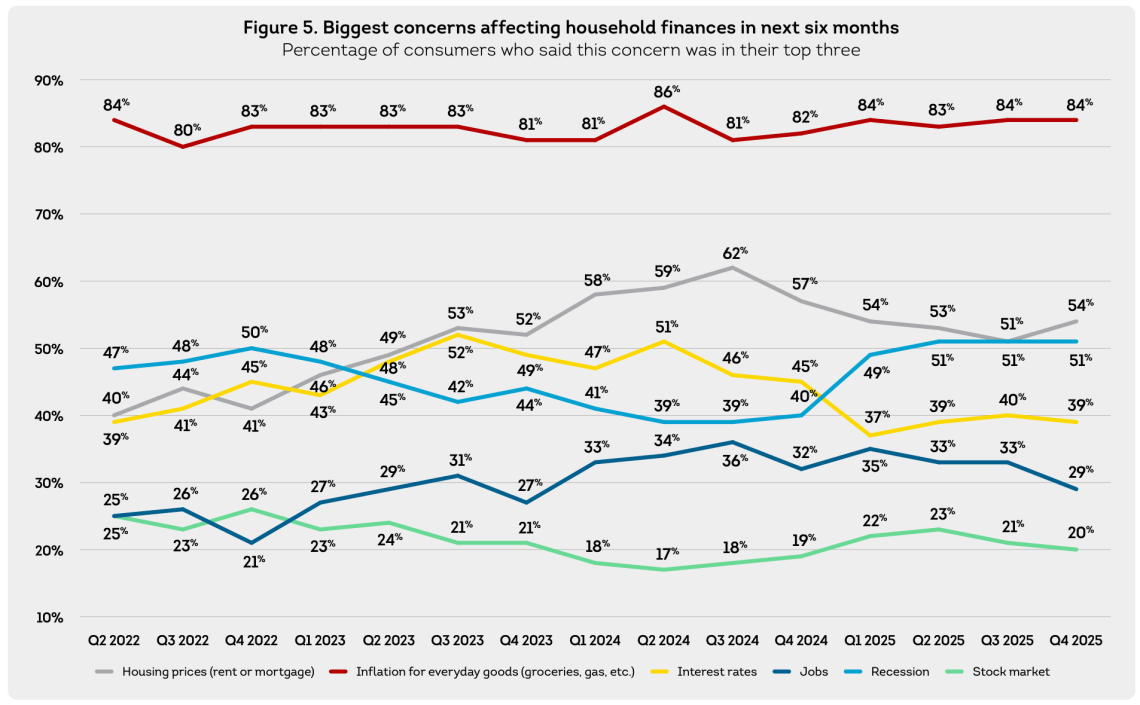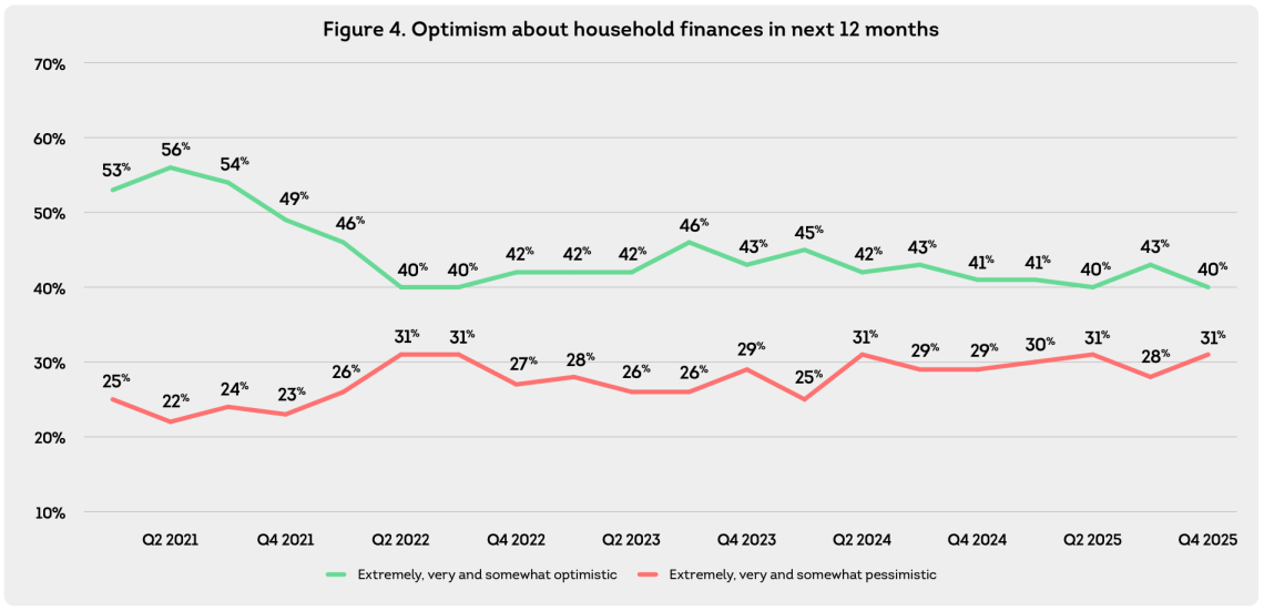 Canadians say they’re doing fine, but they’re still bracing for the worst. Nearly two-thirds of households felt their finances performed as expected or better in Q4 2025. At the same time, just 40% were optimistic about their finances over the next 12 months, down 3 points from the prior quarter. That’s tied for the lowest reading in the past five years, last seen when the trade war kicked off in Q2 2025, and again in 2022 when rates began to climb.