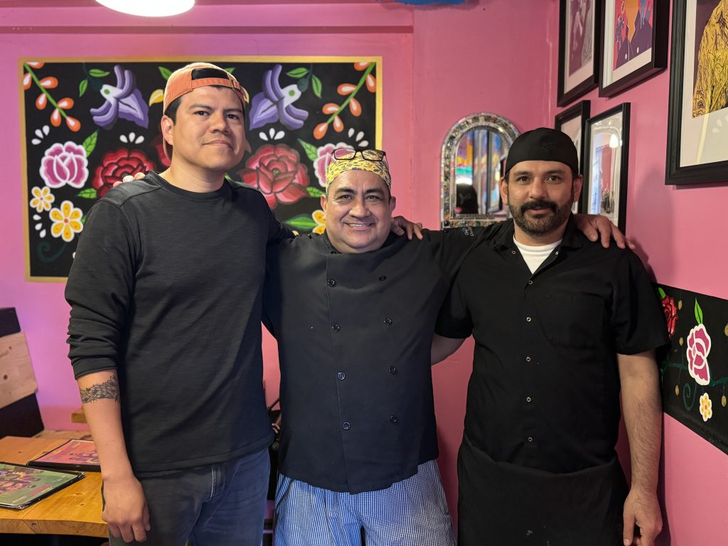 Enrique Chan (left) with his uncle (centre) and a member of his staff (right) at his restaurant ‘Tacos Frida’ located on Notre-Dame Street in Montreal. (Corinne Boyer, CityNews)