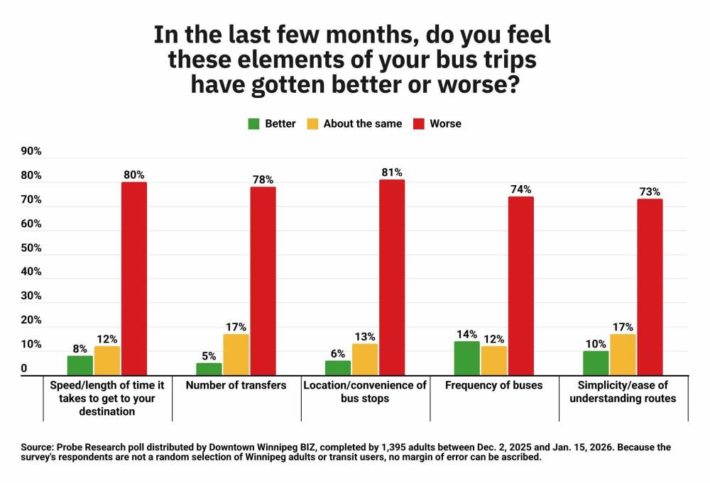 The people using transit to get downtown don’t like it, either. More than eight in 10 of them are unhappy with the new system, a Probe Research survey commissioned by the Downtown Winnipeg BIZ found.