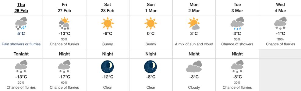 Friday is looking downright chilly, with a high of -13°C and an overnight low of -17°C. On the bright side, a light can be seen at the end of the tunnel, with daytime highs above zero to kick off next week.