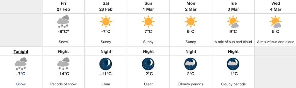 Saturday will also be brisk, with a high of -7°C and an overnight low of -11°C. Things will surely turn around on Sunday, with a high of 7°C, kicking off a stretch of daytime highs above freezing through to Wednesday, March 4.