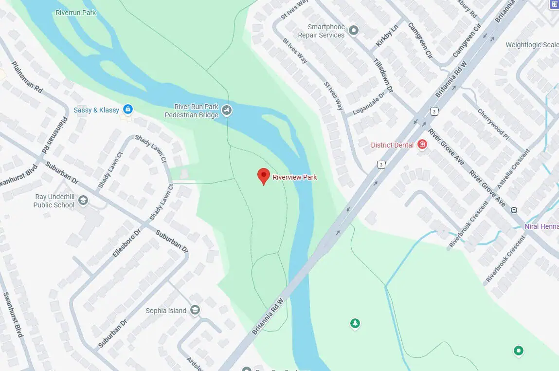 Looking north from Britannia Road West toward Riverview Park, which sits on the banks of the Credit River.