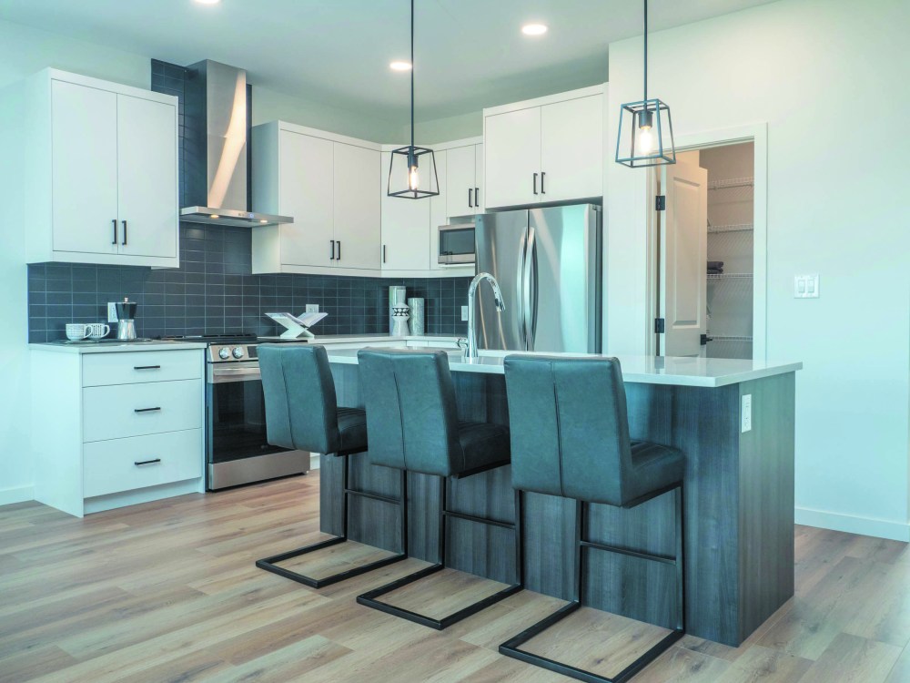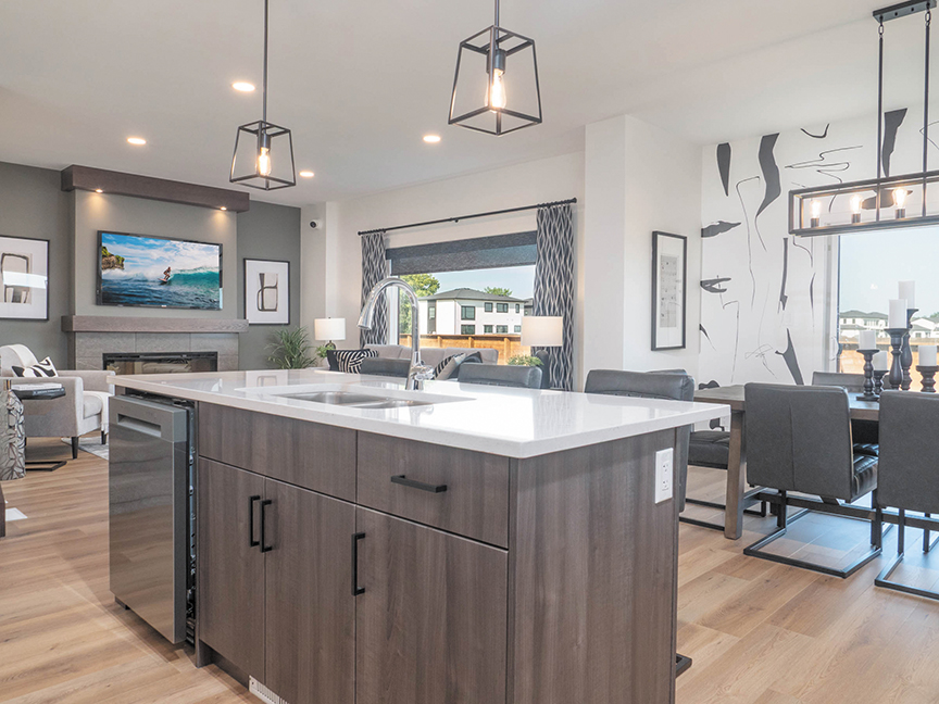 “The kitchen is the heart of every home. We’ve designed it in a way so the walk-in pantry is next to the kitchen but it’s not taking away the cabinets — so you have a little bit more functionality. You also have a beautiful island with a sink overlooking the eating area in the great room, which is nice. The great room has an electric fireplace, which is popular because you can change the colours while still getting the heat source that you’re looking for.”