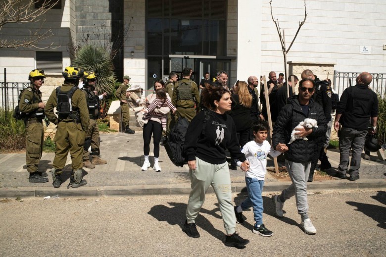 Residents are evacuated from a building hit by a projectile in Tirat Hacarmel, northern Israel, Saturday, Feb. 28, 2026. No injuries were reported. (AP Photo/Leo Correa)
