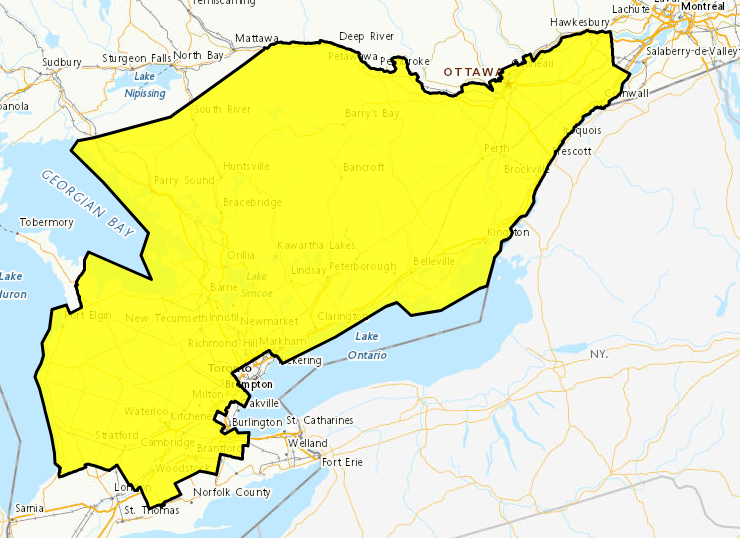 The warning extends from London in the southwestern part of the province as far east as the Quebec border.
