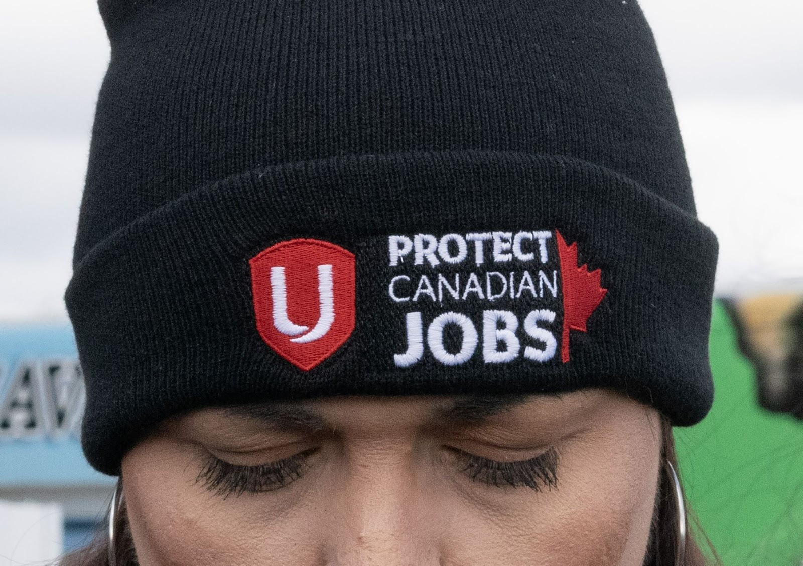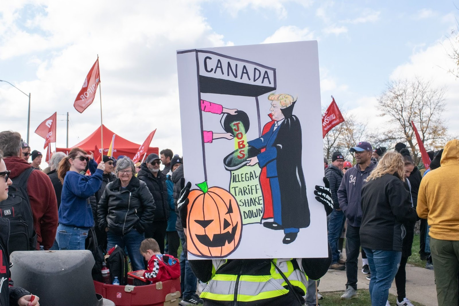 One protester at Unifor’s “Protect Canadian Jobs” rally outside the Stellantis Brampton Assembly Plant on October 29 holds a sign criticizing U.S. tariffs.