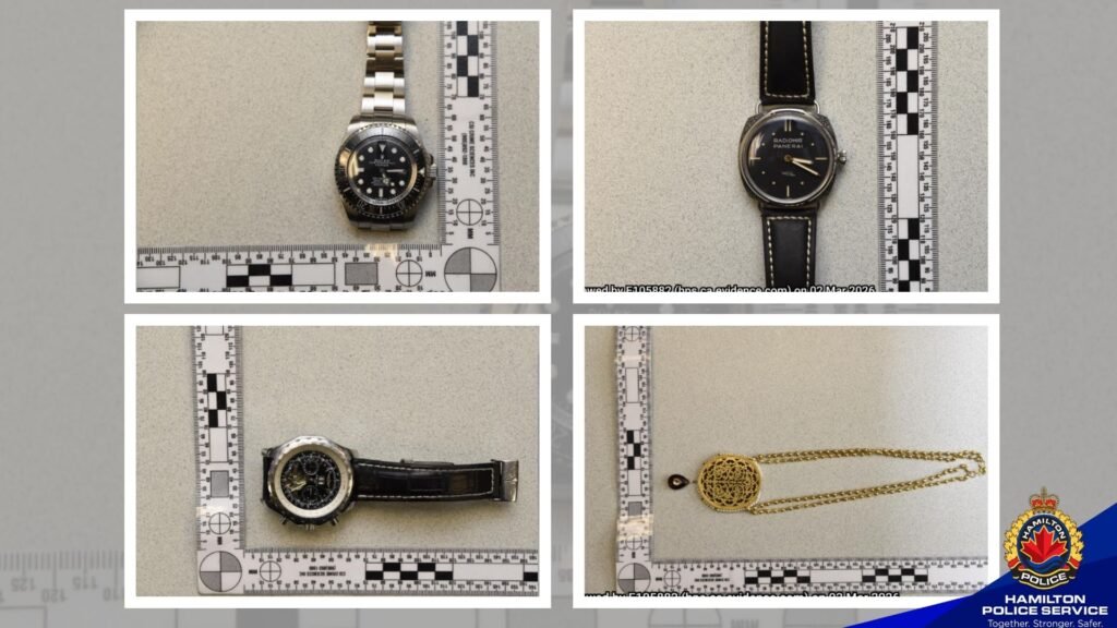 A four-panel police evidence display showing items believed to be recovered property. The top-left image shows two gold-coloured chain necklaces and a ring placed on a white surface beside a yellow evidence marker. The top-right image shows several watches and circular jewellery pieces arranged next to a measurement scale. The bottom-left image displays designer-style handbags, wallets, sunglasses, keys, and multiple wristwatches laid out in rows. The bottom-right image shows additional bags, jewellery, watches, and personal accessories arranged for documentation.Source:Hamilton Police service