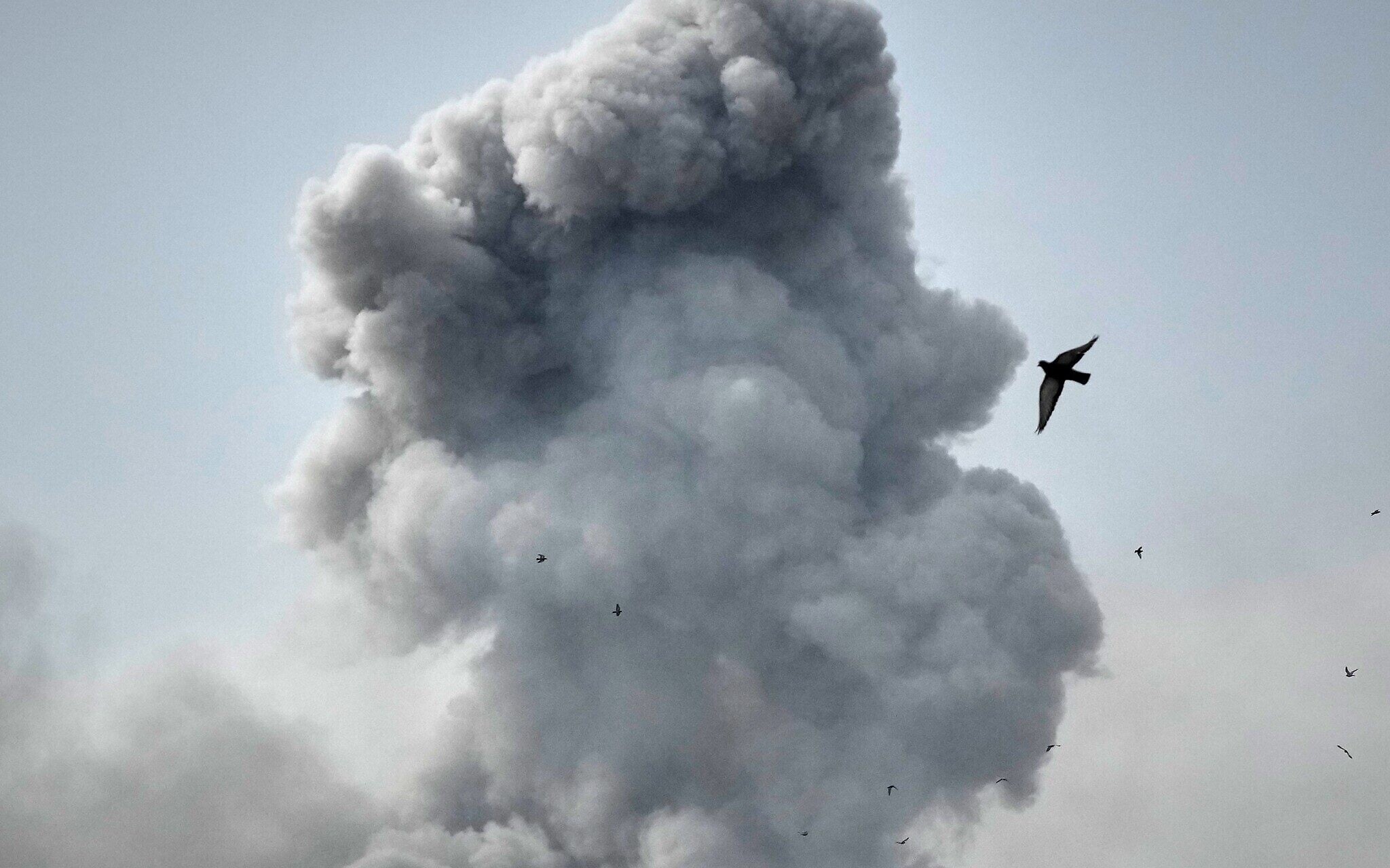 A bird flies by a plume of smoke rising after a strike in Tehran, Iran, March 2, 2026. (AP Photo/Vahid Salemi)