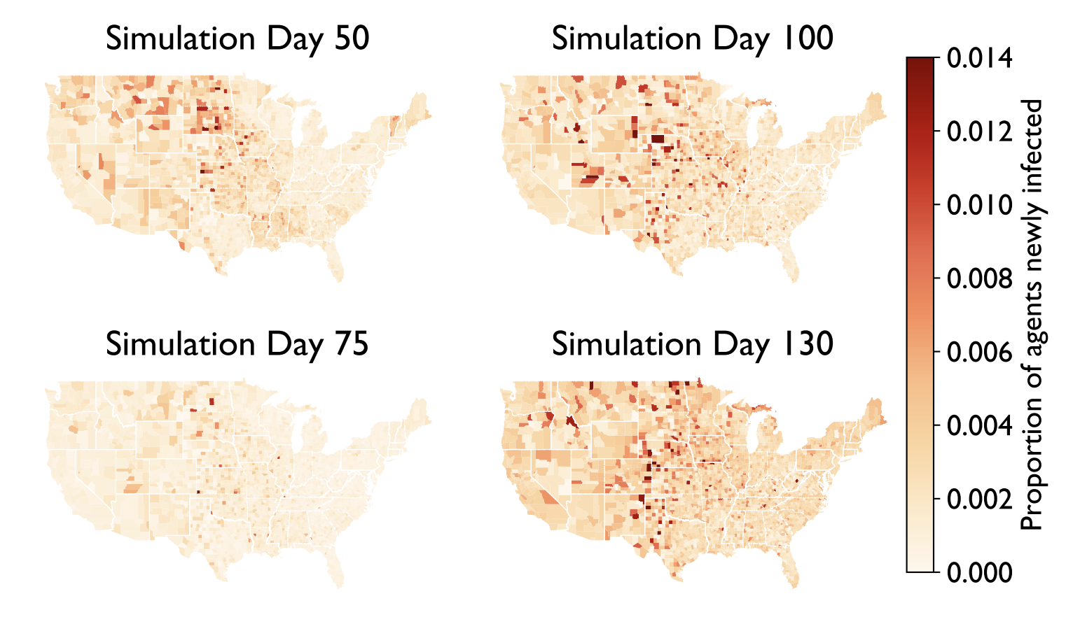 An EpiCast simulaiton models behavioral information and county-level disease cases over time. (Image: Joy Kitson.)