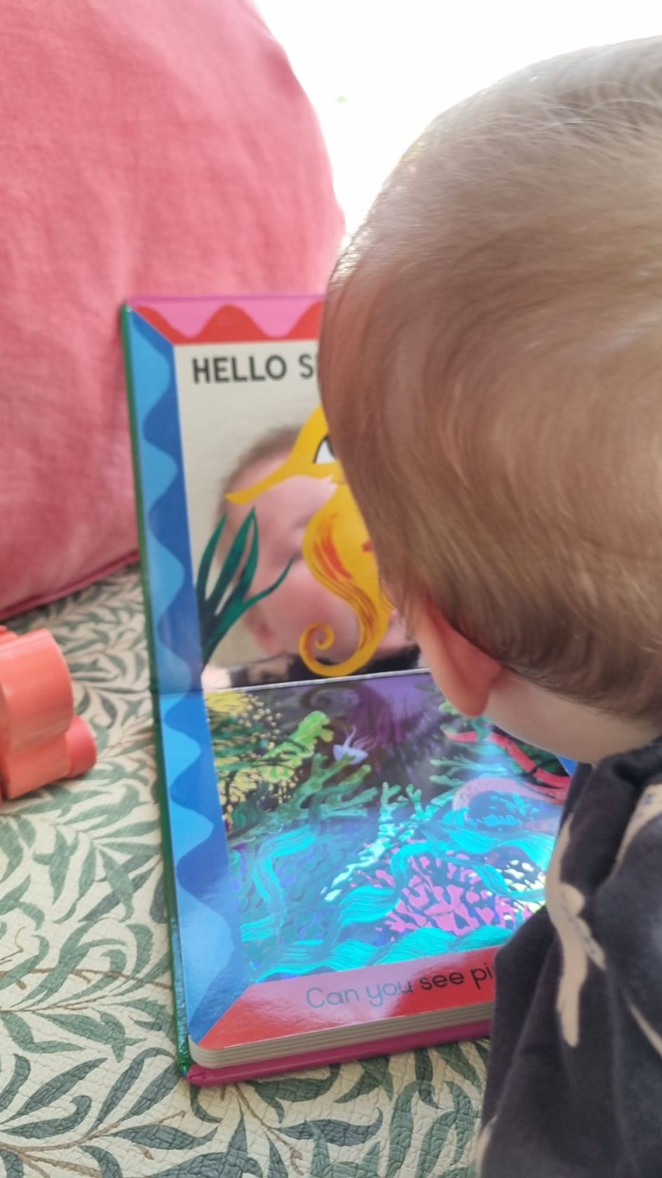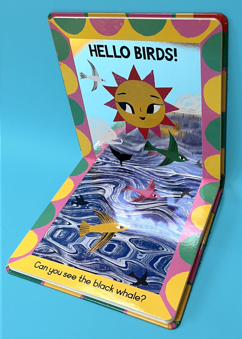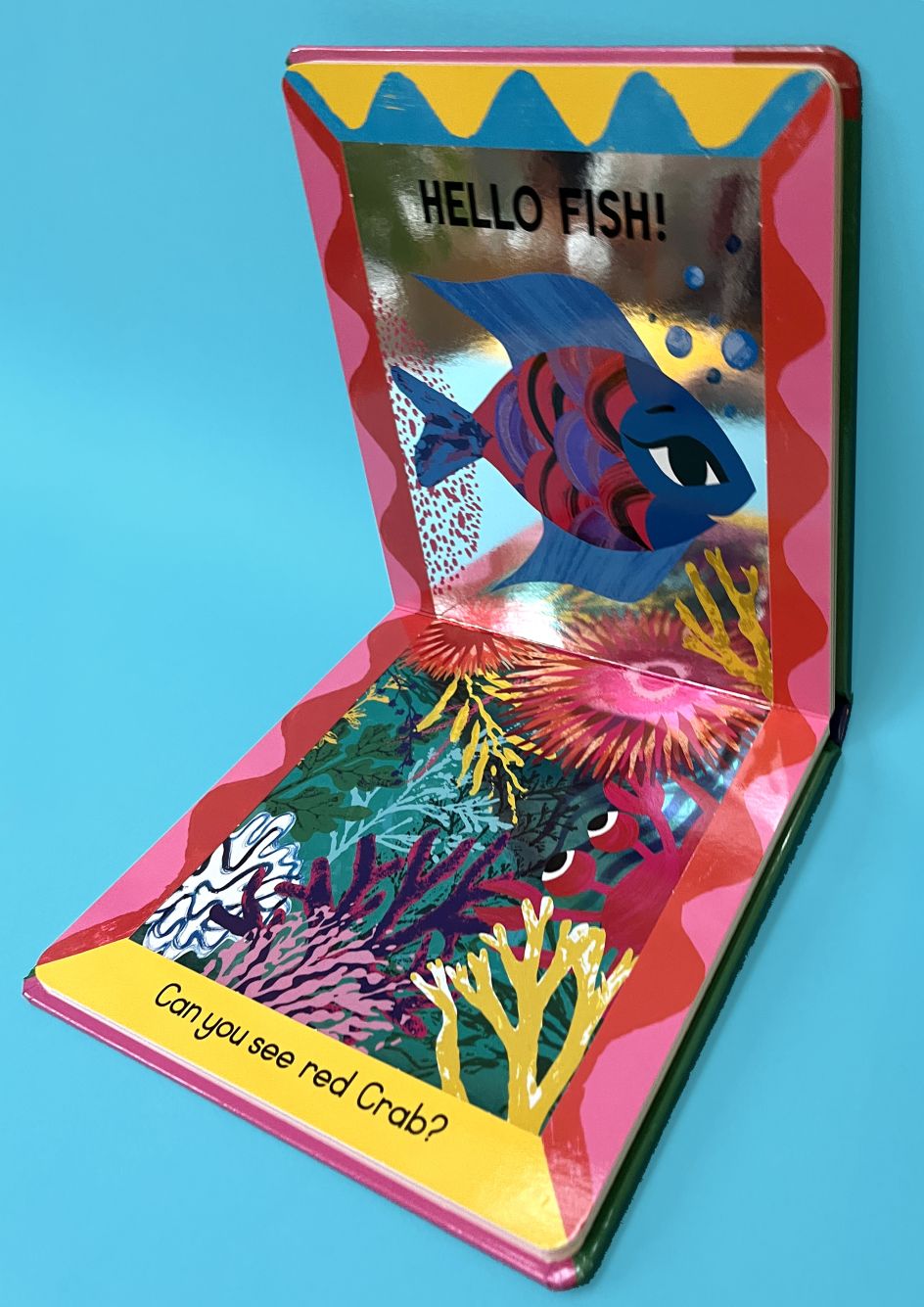 Hello Sun and Hello Fish have just come out, joining Hello Bunny and Hello Bee on the children’s bookshelf, and six more are on the way. The concept is stunningly simple, and the outcome is simply stunning. Sharon creates tactile, textured imagery of all kinds of creatures and characters, which is printed on mirror board pages. When a child looks inside, a three-dimensional scene is created with a mirror panel reflecting environmental imagery on the facing page.