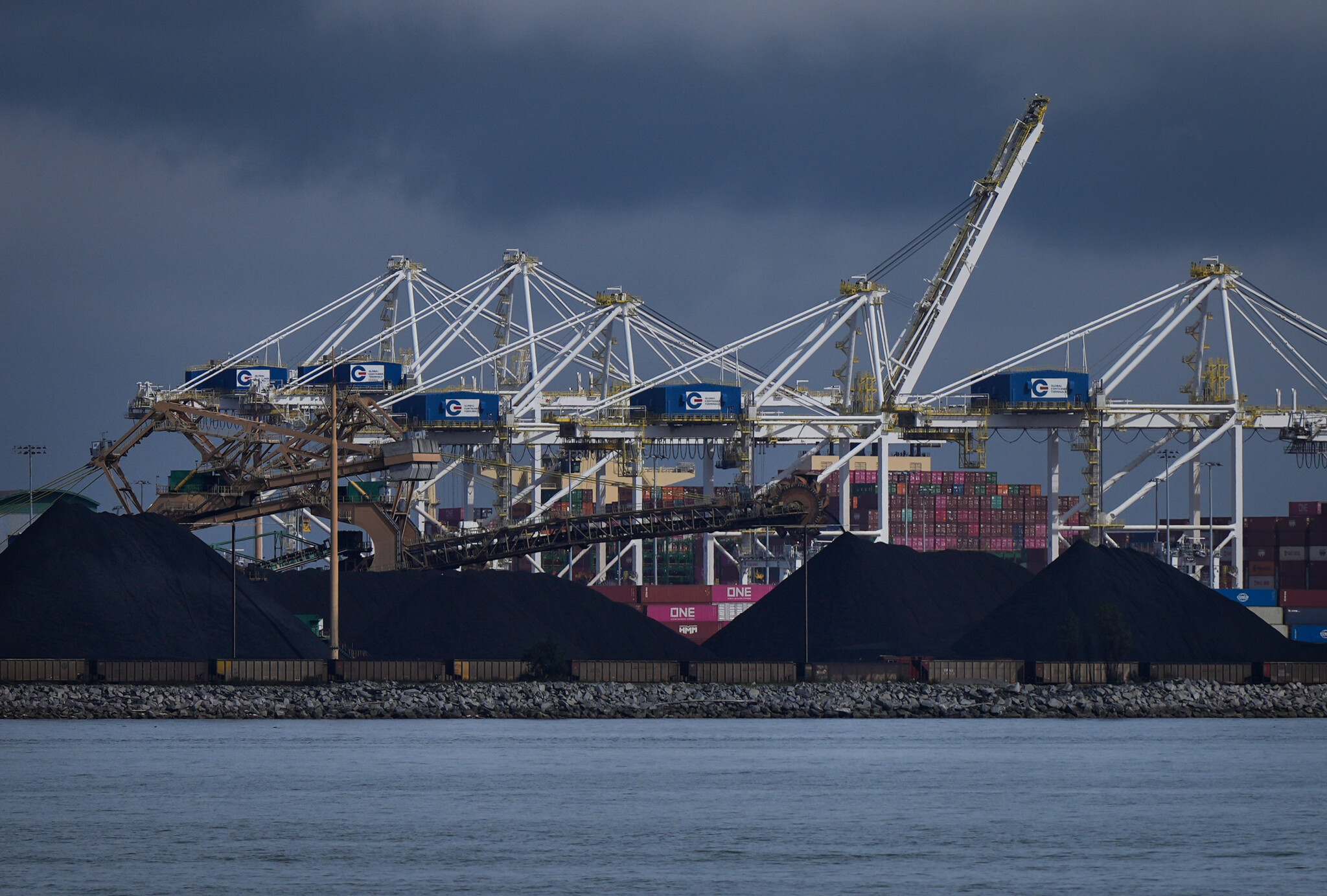 Piles of coal at the Westshore coal export terminal at Roberts Bank and gantry cranes used to load and unload containers onto and from cargo ships are seen at Deltaport, in Tsawwassen, B.C., on Monday, September 9, 2024. Darryl Dyck/The Canadian Press.