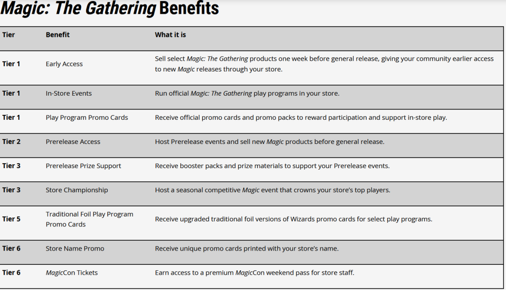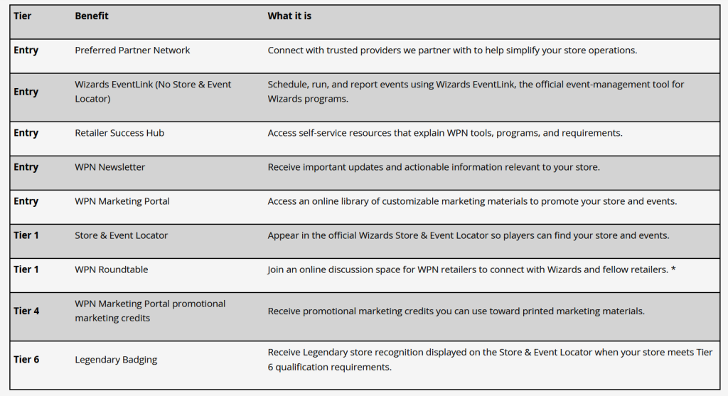 Under the new tier-based system, each store’s performance will be measured quarterly through metric analysis with the goal of rewarding stores for “…consistency and real player engagement rather than single events or short-term spikes.” Moving away from the one-time application process, recognition will be evaluated on “standard calendar quarters rather than from the date a store joins the WPN or reaches a specific tier…” and benefits that were “previously exclusive to WPN Premium” will now be incorporated into specific tiers. WotC provided the table below to highlight what WPN benefits will be available at each tier.