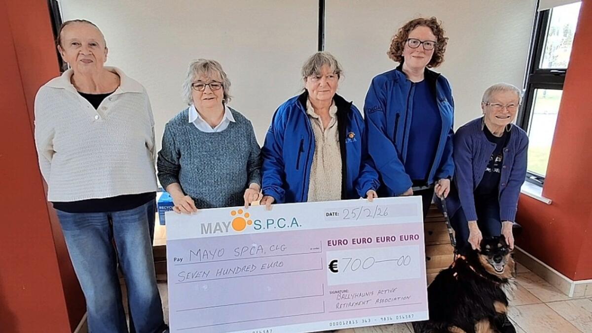 Pictured at a presentation to members of Mayo SPCA on the last day of activities of Ballyhaunis Active Retirement Association were (from left): Eithne Glynn, Maura Fitzmaurice, Jackie Reilly, Lucy Kavanagh and Maureen Higgins.