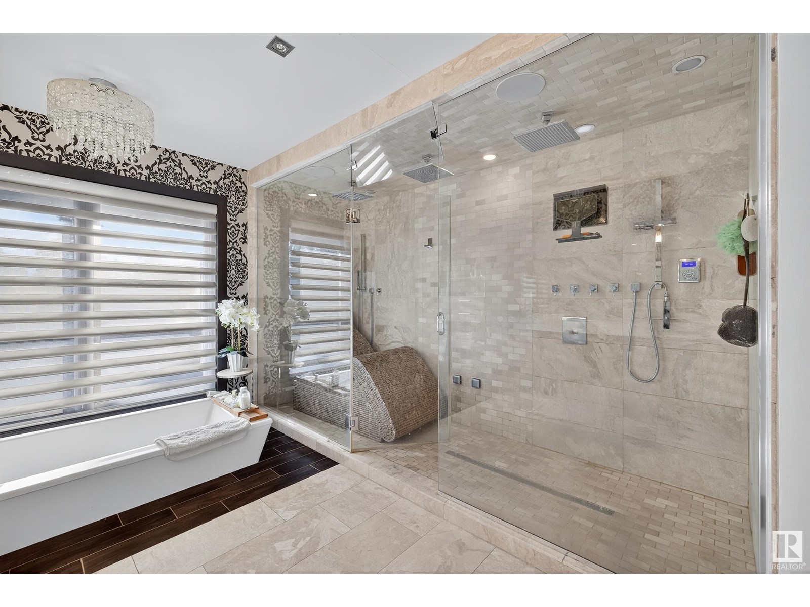 Upstairs, the primary suite feels more like a posh hotel. There’s a seating area, a stylish walk-in closet, a wet bar, and a spa-like ensuite with a deep soaker tub and an extra-large shower you could hang out in for hours.