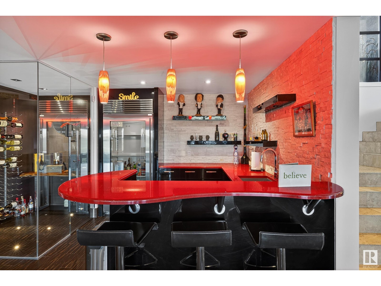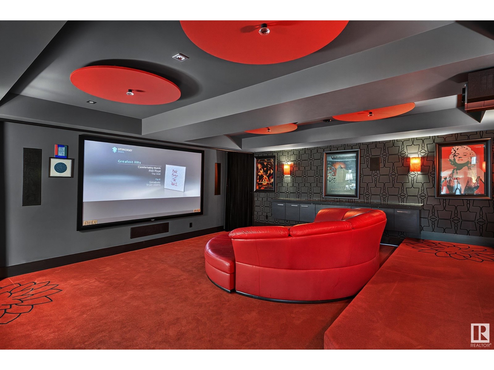 Downstairs, you’ll find a vibrant red wet bar, billiards area, wine rack, and a private theatre that really leans into the red theme. There’s also a guest suite and a home office tucked away.