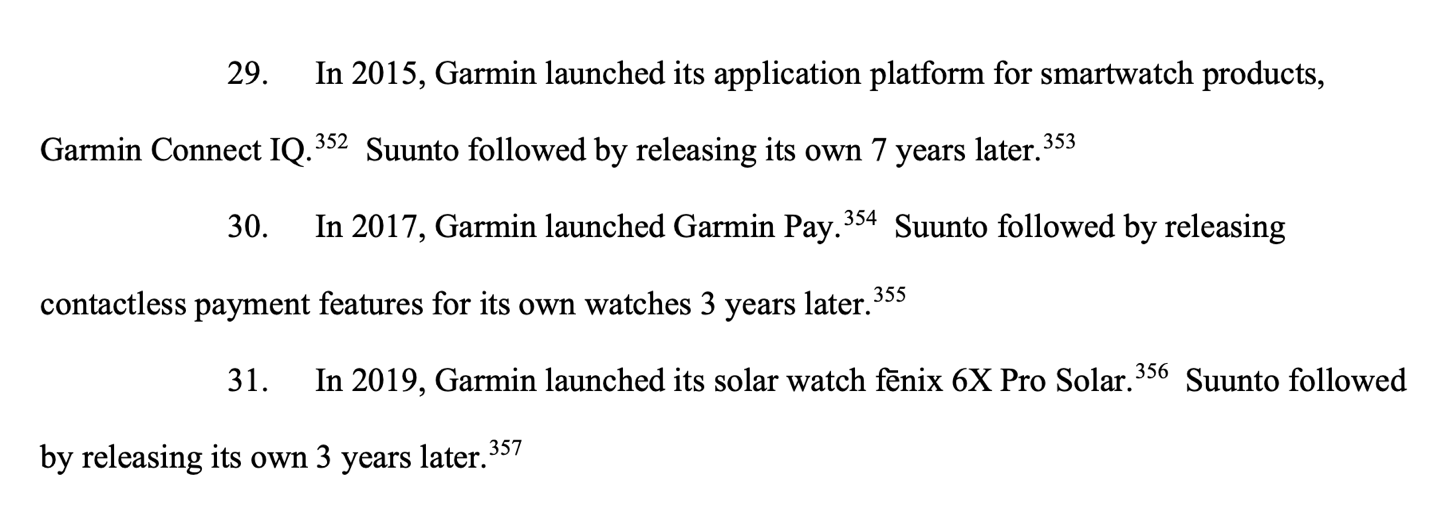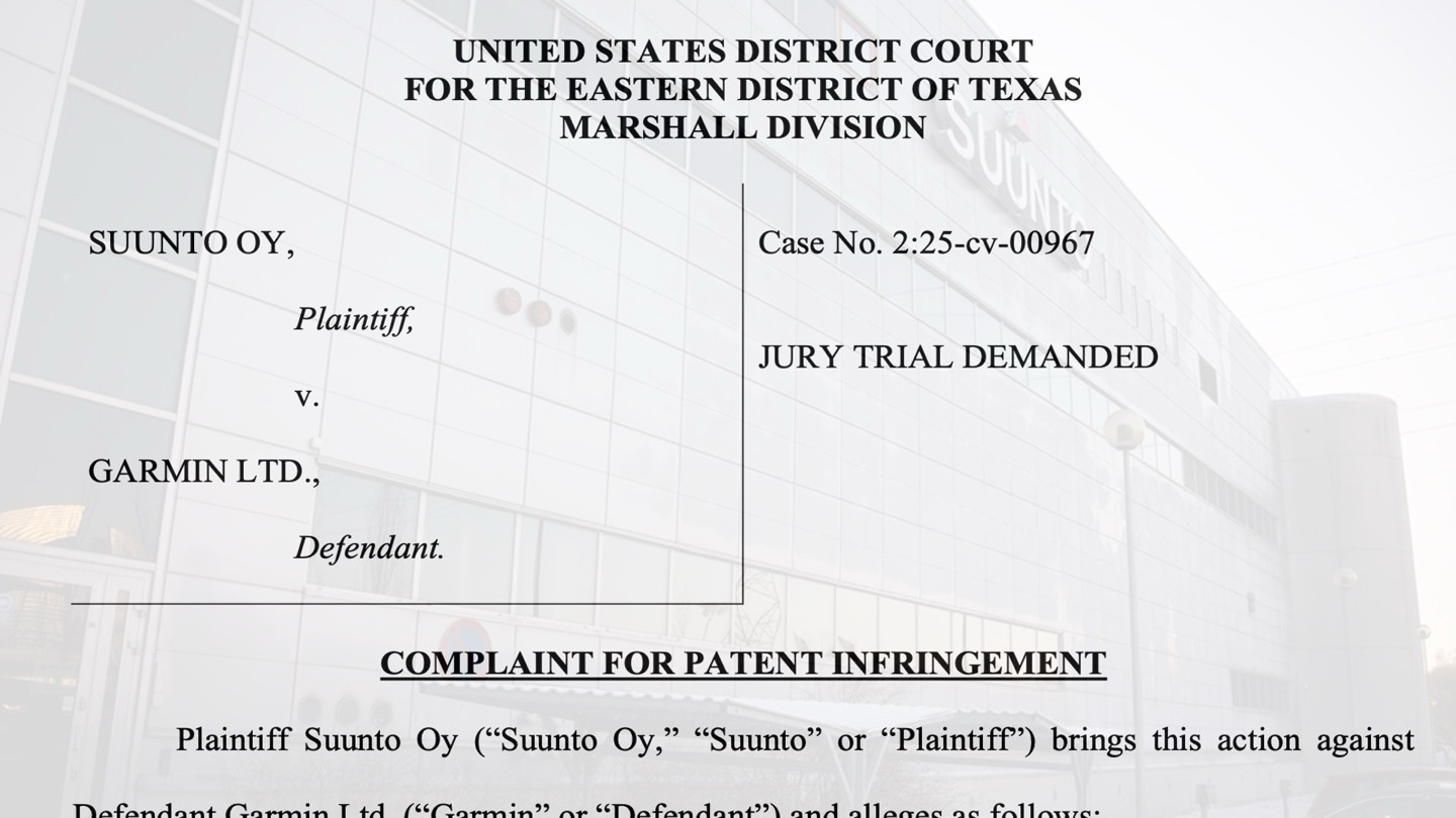 In Suunto’s 56-page filing, things are honestly pretty vanilla. While we often see grandiose lawyer fun in filings, including extravagant claims about a company’s importance in the universe, Suunto’s is pretty mellow. The vast majority of the filing is simply listing off the 9,328 different Garmin watch models that encompass these features, as required by the courts to establish which models are allegedly infringing.