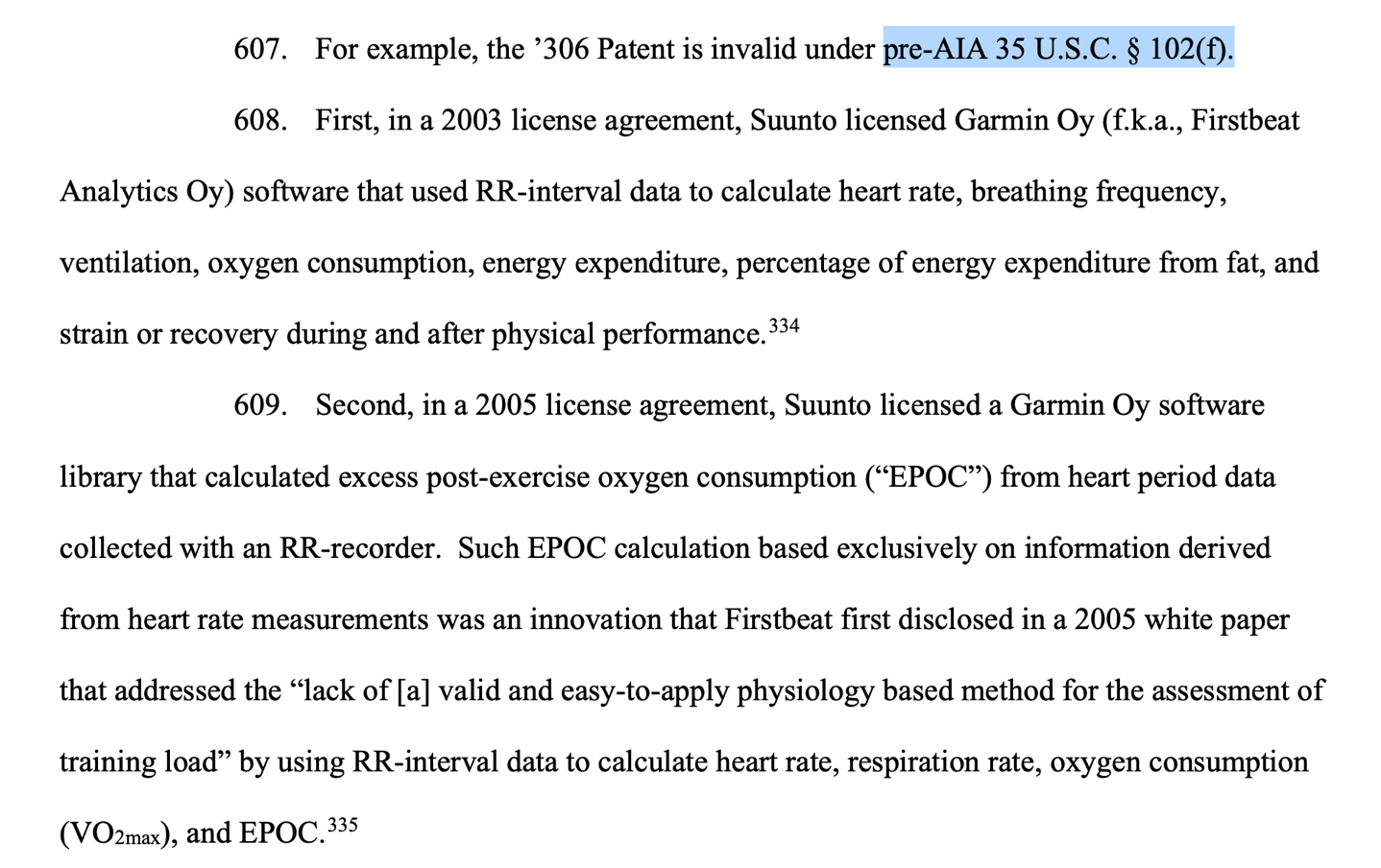 As we start to get into some of the patents, things get spicy quickly. They point out that Suunto’s ‘306 patent (the one about respiration rate via HR) is actually something Suunto licensed from Garmin starting back in 2003. They then call out a provision (pre-AIA 35 U.S.C. § 102(f)), which basically states you can’t patent something you learned from someone else. And given that Suunto’s ‘306 patent literally references Garmin’s own patent as prior art, Garmin is doing a bit of a double-take here: