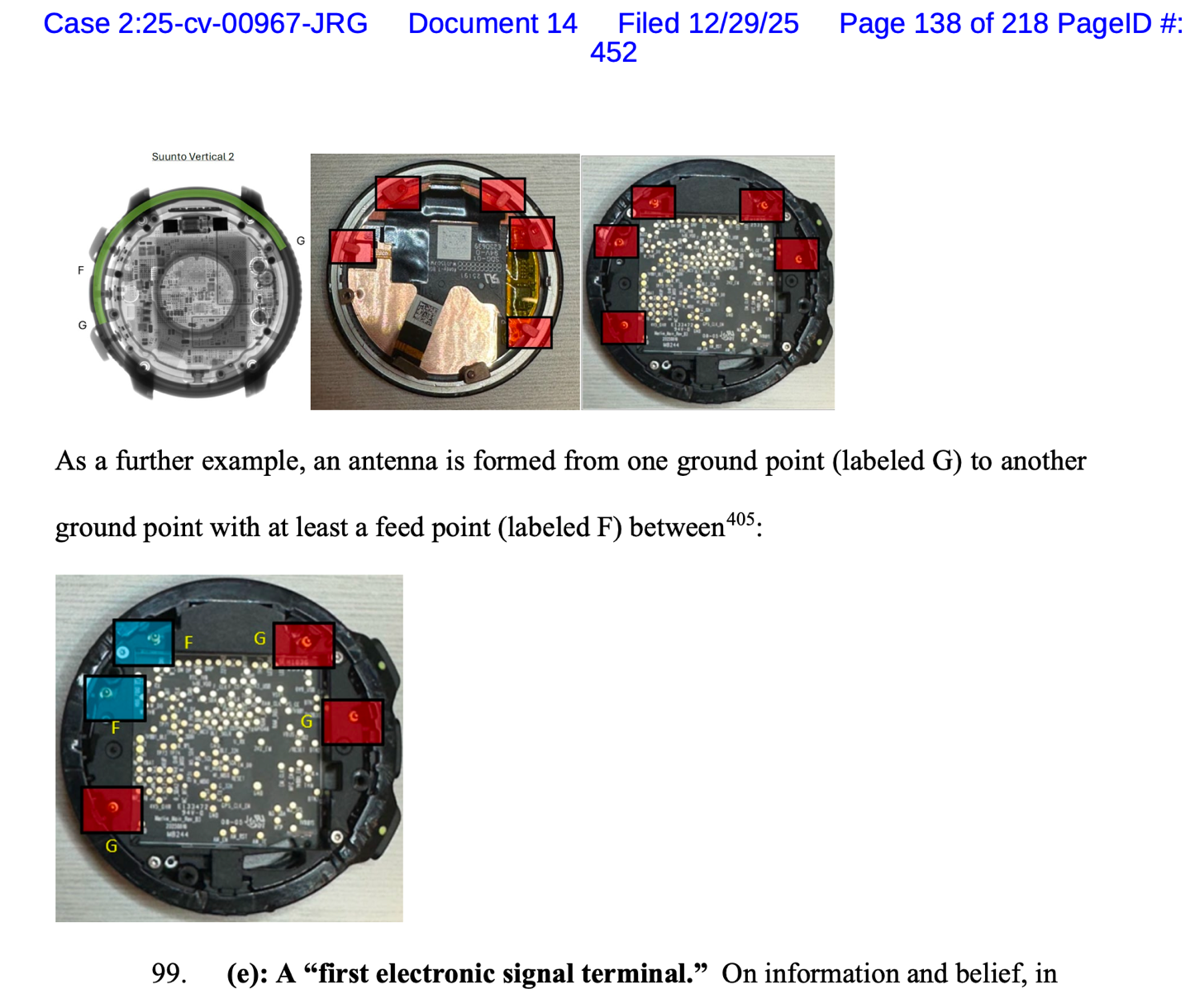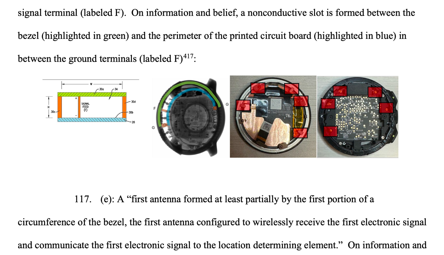 As part of the filing, they spent about 25 pages alone on photographs, diagrams, x-ray scans, and an assortment of text, illustrating that Garmin believes Suunto straight-up duplicated antenna design from Garmin’s products and patents.