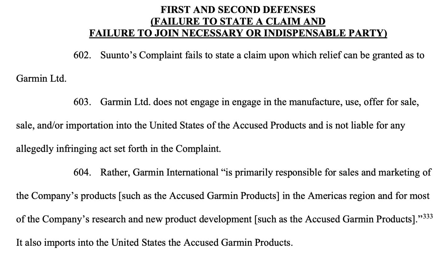 Garmin’s document is essentially divided up into about a dozen different ‘defenses’. Some of this stuff is just procedural, but some of it is very real technical talk. However, the very first defense is that Suunto literally sued the wrong company. I’m not kidding. Garmin, of course, has a bunch of corporate entities, and basically, Suunto’s lawyers picked the wrong one.