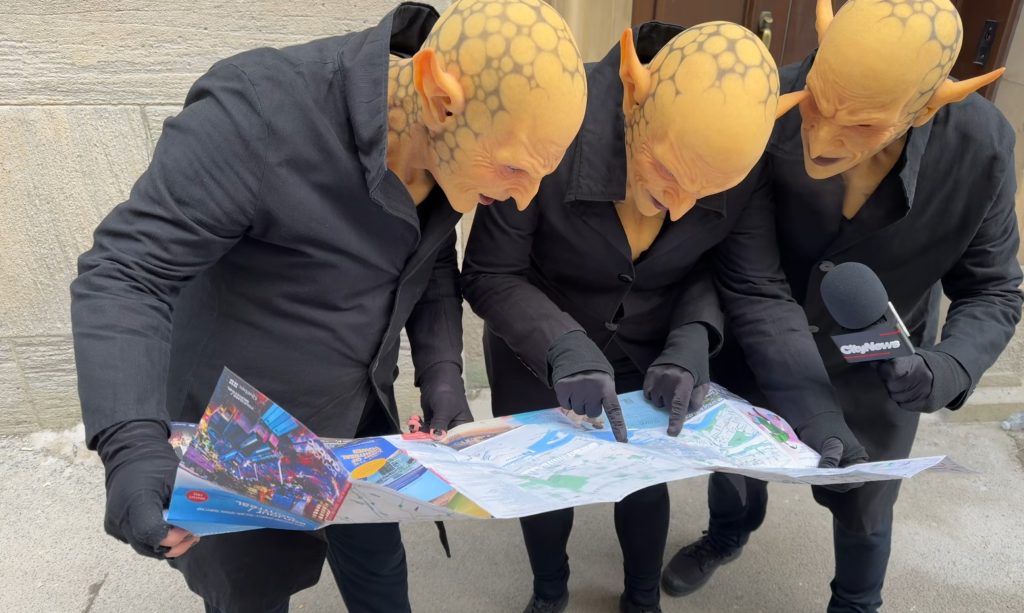 Moog (left), Kragva (centre) and Wug (right), looking at a map of Montreal’s Old Port, as they attempt to find the perfect venue where they plan to present their version of Shakespeare’s Macbeth. (Corinne Boyer, CityNews)
