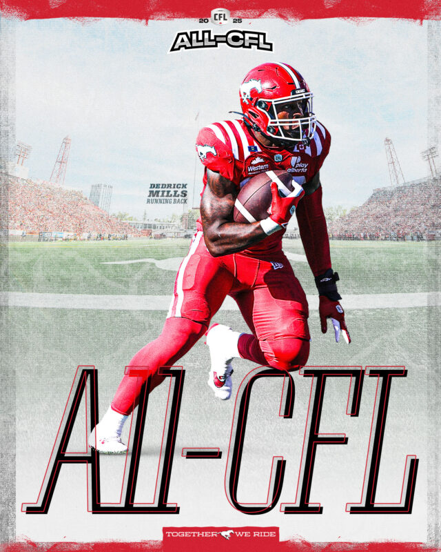 Mills won the CFL rushing crown this season and earned the Stampeders’ nomination for Most Outstanding Player. He had single-season career highs of 1,409 rushing yards and 11 rushing touchdowns and also had 33 receptions for 292 yards. Mills produced four 100-yard rushing games this season and led the league with 46 carries of at least 10 yards.