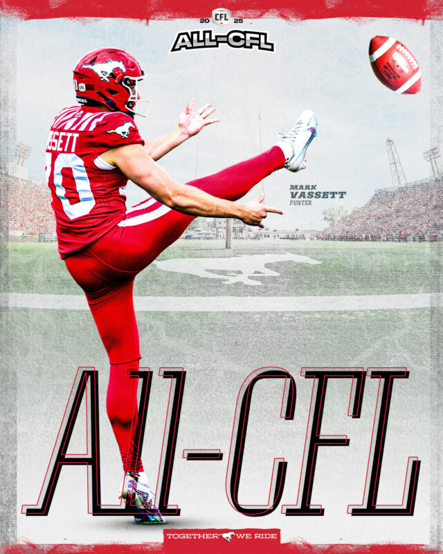 The Australian rookie made an impact in his first season with the Stamps as he led the CFL with a net punting average of 41.7 yards – a single-season league record – and also set a new team standard with a gross punting average of 50.0 yards. Vassett, the Stamps’ nominee for Most Outstanding Special Teams Player, had seven punts that pinned the opposition inside the 10-yard line and served as the holder on place kicks.