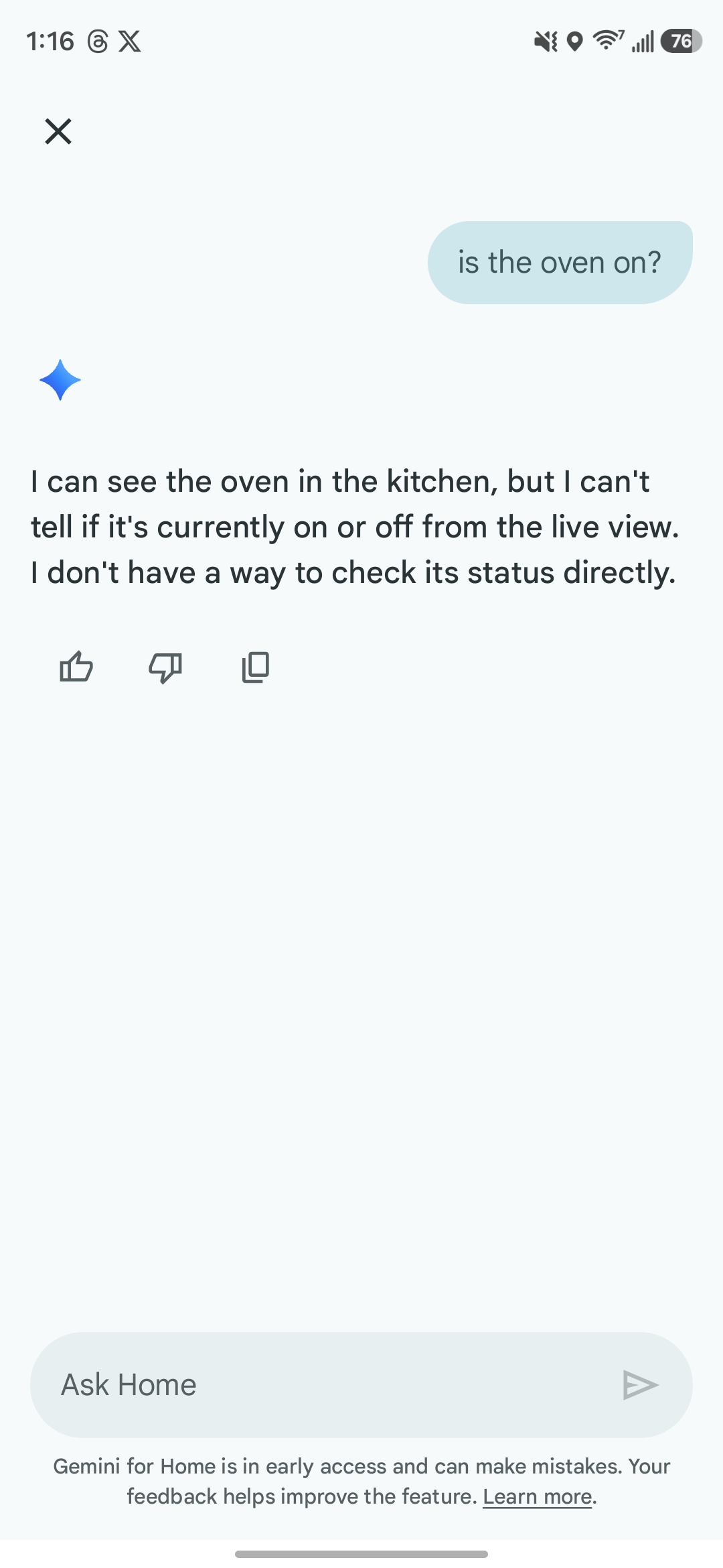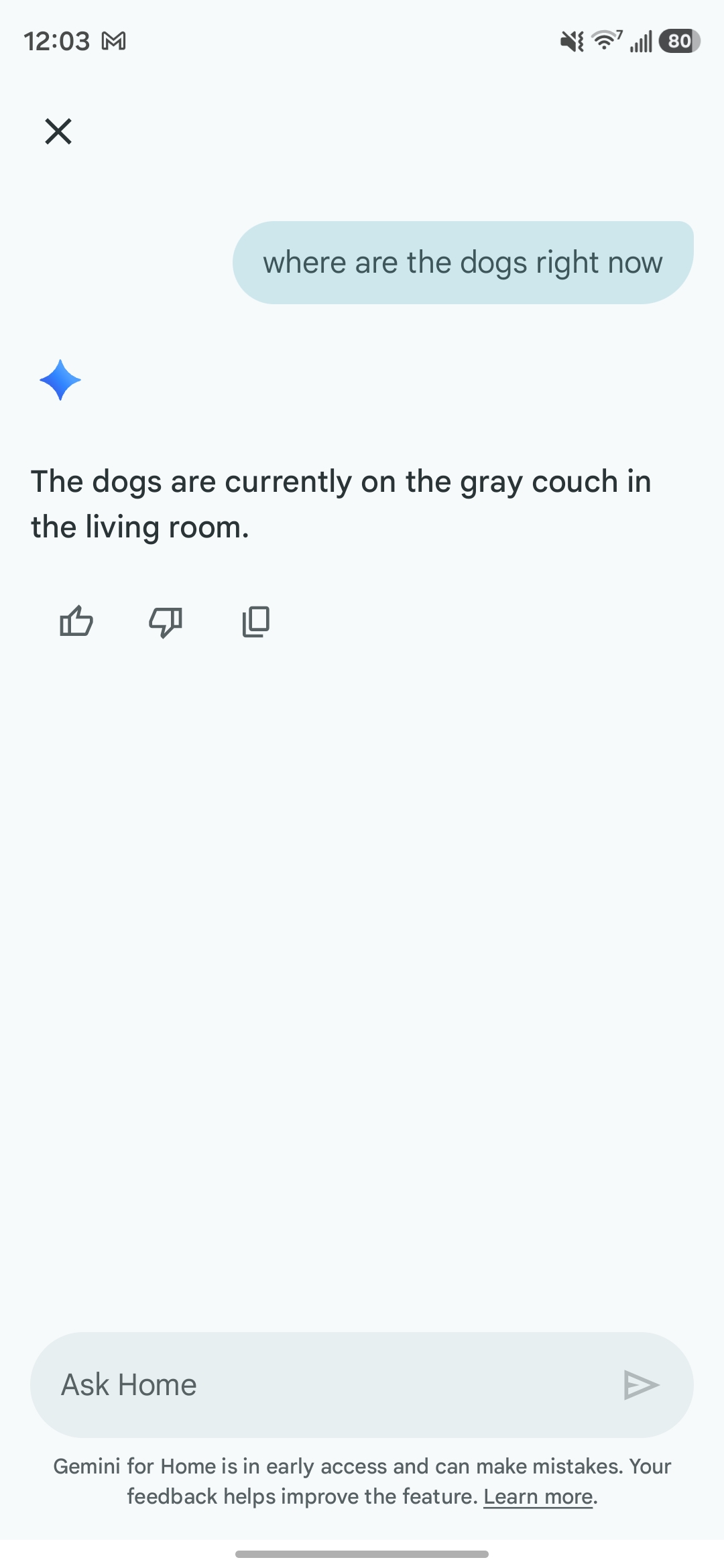 I tested this by asking “Where are the dogs right now?” to which it correctly answered that they were in the living room on the couch – though, notably, only one of the two dogs was on the couch, with the other elsewhere in the room. Another test that came to mind was “Is the oven on?” Gemini responded to this by saying it couldn’t check based on the camera view alone, which is absolutely the correct response. In some other test queries such as “Is there anyone outside my house?,” Gemini also pulled up relevant clips from the past couple of hours on top of reporting the current conditions.