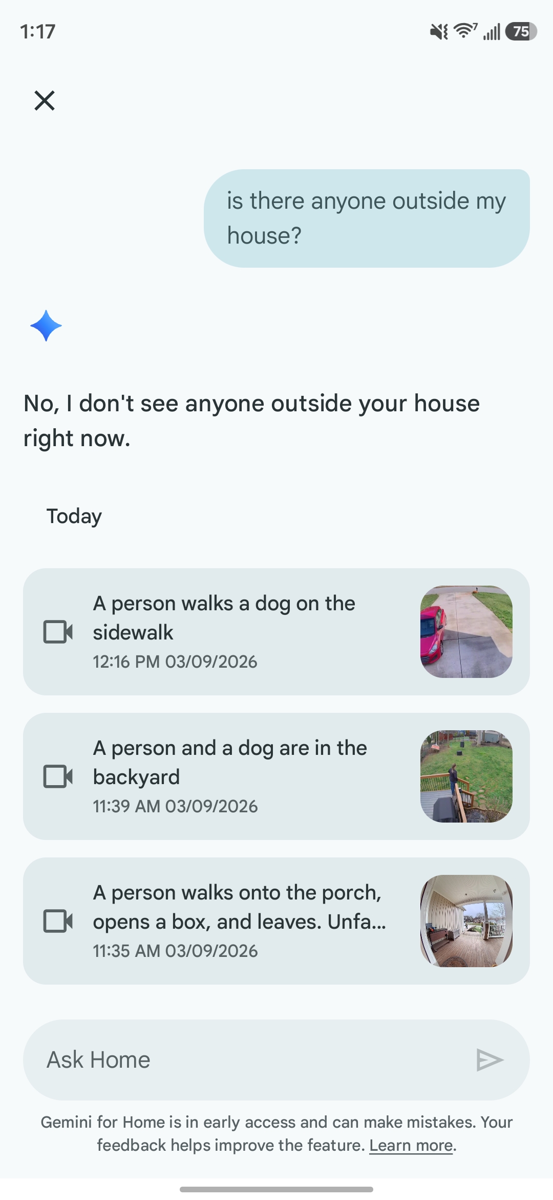 Through the usual “Ask Home” search bar, you can ask a question about what’s currently happening in or around your home, and Gemini will scan through all of your live video feeds to figure out the answer.