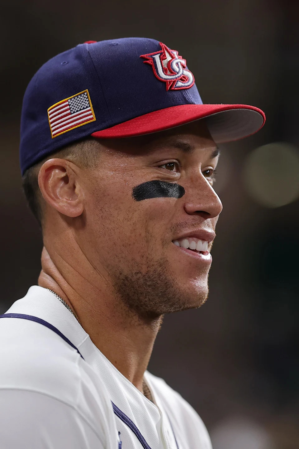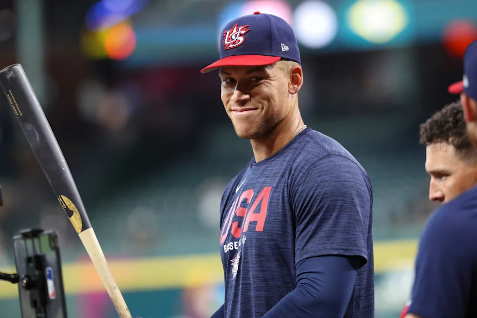 HOUSTON, TEXAS – MARCH 07: Aaron Judge #99 of Team United States looks on prior to a 2026 World Baseball Classic Pool B game against Team Great Britain at Daikin Park on March 07, 2026 in Houston, Texas. (Photo by Alex Slitz/Getty Images)