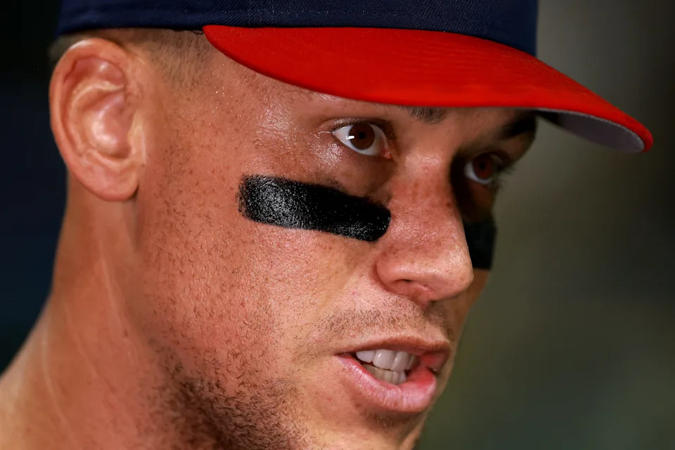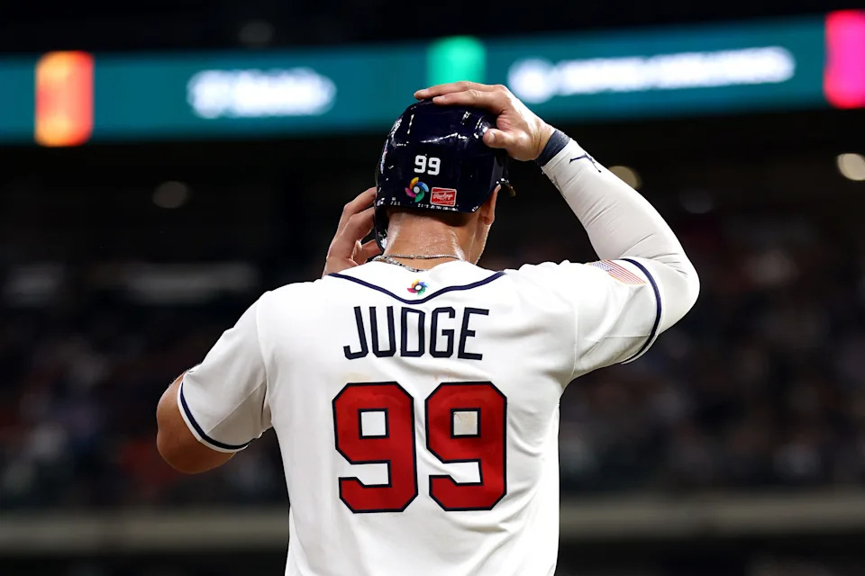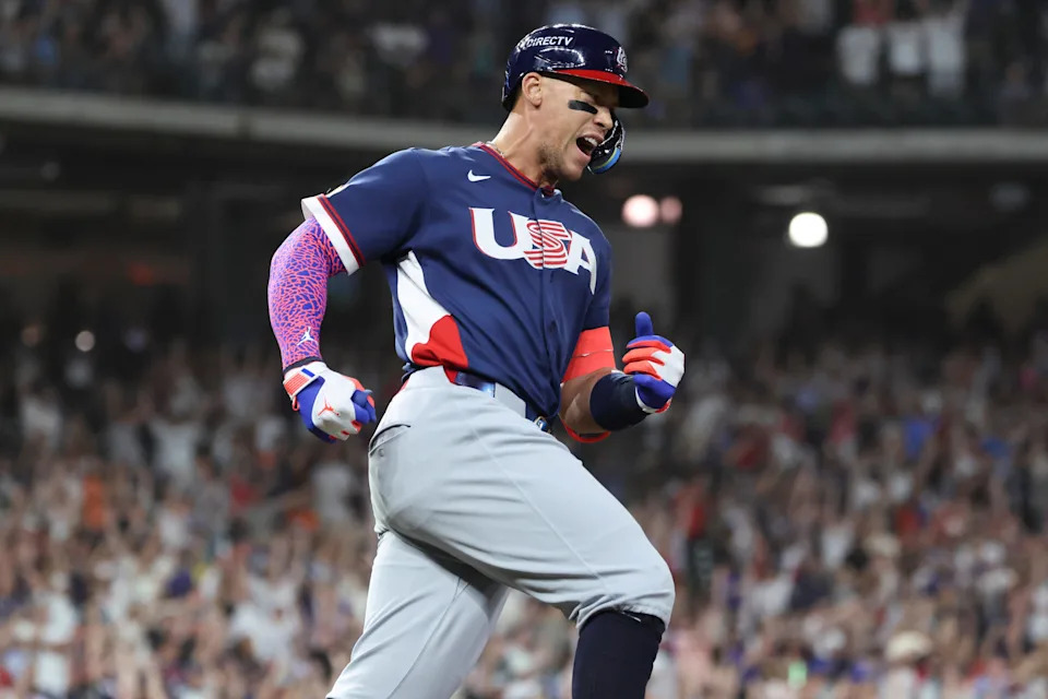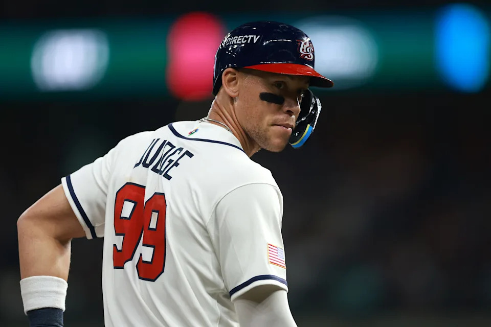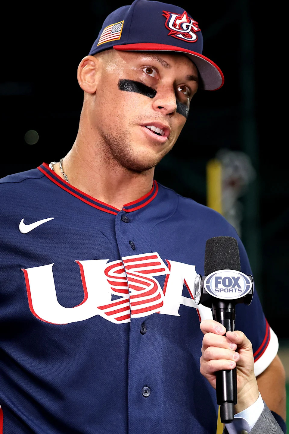 HOUSTON, TEXAS – MARCH 06: Aaron Judge #99 of the United States speaks with the media after defeating Brazil during the 2026 World Baseball Classic Pool B game between the United States and Brazil at Daikin Park on March 06, 2026 in Houston, Texas. (Photo by Kenneth Richmond/Getty Images)