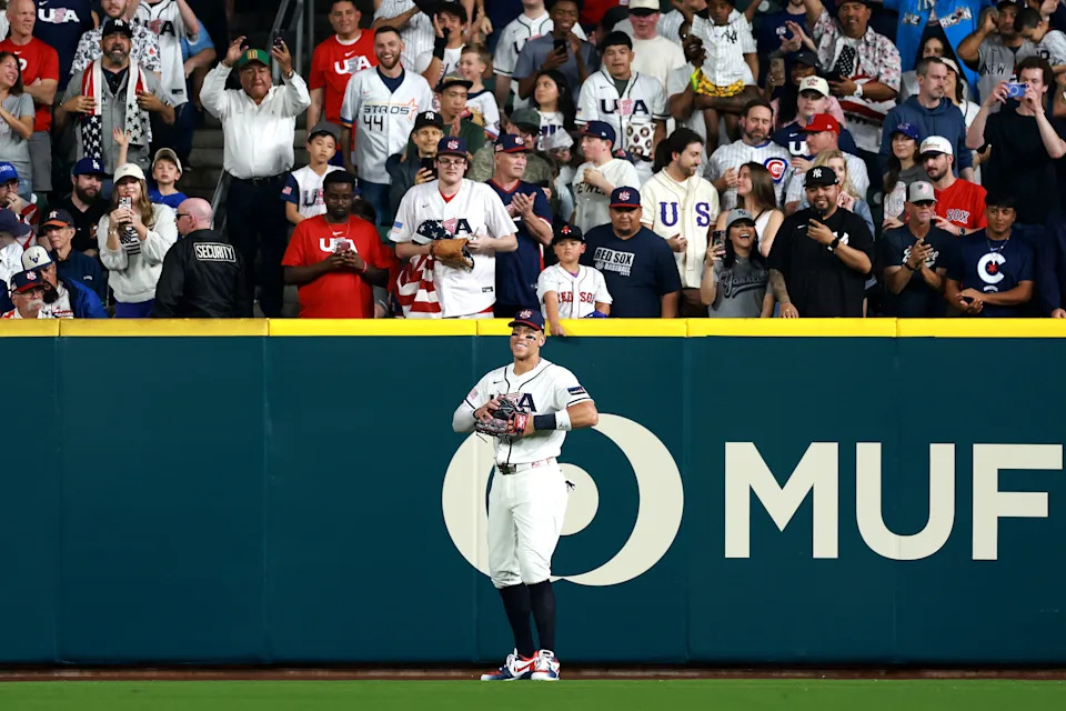 HOUSTON, TEXAS – MARCH 07: Aaron Judge #99 of the United States looks on during the 2026 World Baseball Classic Pool B game between Great Britain and the United States at Daikin Park on March 07, 2026 in Houston, Texas. (Photo by Kenneth Richmond/Getty Images)