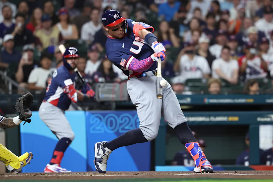 HOUSTON, TEXAS – MARCH 07: Aaron Judge #99 of the United States in action during the 2026 World Baseball Classic Pool B game between Great Britain and the United States at Daikin Park on March 07, 2026 in Houston, Texas. (Photo by Kenneth Richmond/Getty Images)