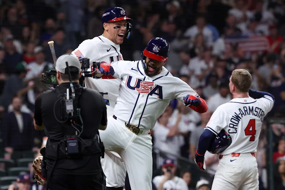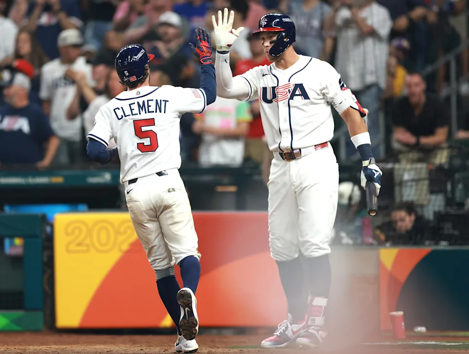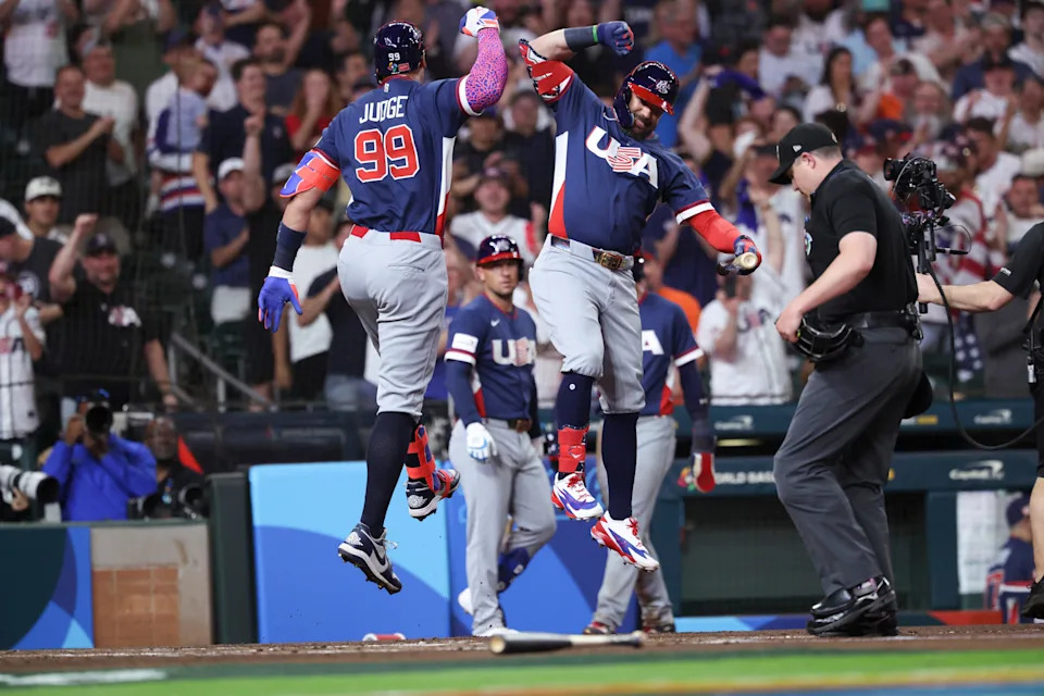 HOUSTON, TEXAS – MARCH 07: Aaron Judge #99 and Ernie Clement #5 of the United States celebrate during the 2026 World Baseball Classic Pool B game between Great Britain and the United States at Daikin Park on March 07, 2026 in Houston, Texas. (Photo by Kenneth Richmond/Getty Images)