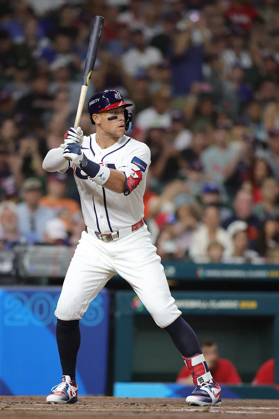 HOUSTON, TEXAS – MARCH 07: Aaron Judge #99 of Team United States bats in the first inning against Team Great Britain during a 2026 World Baseball Classic Pool B game at Daikin Park on March 07, 2026 in Houston, Texas. (Photo by Alex Slitz/Getty Images)