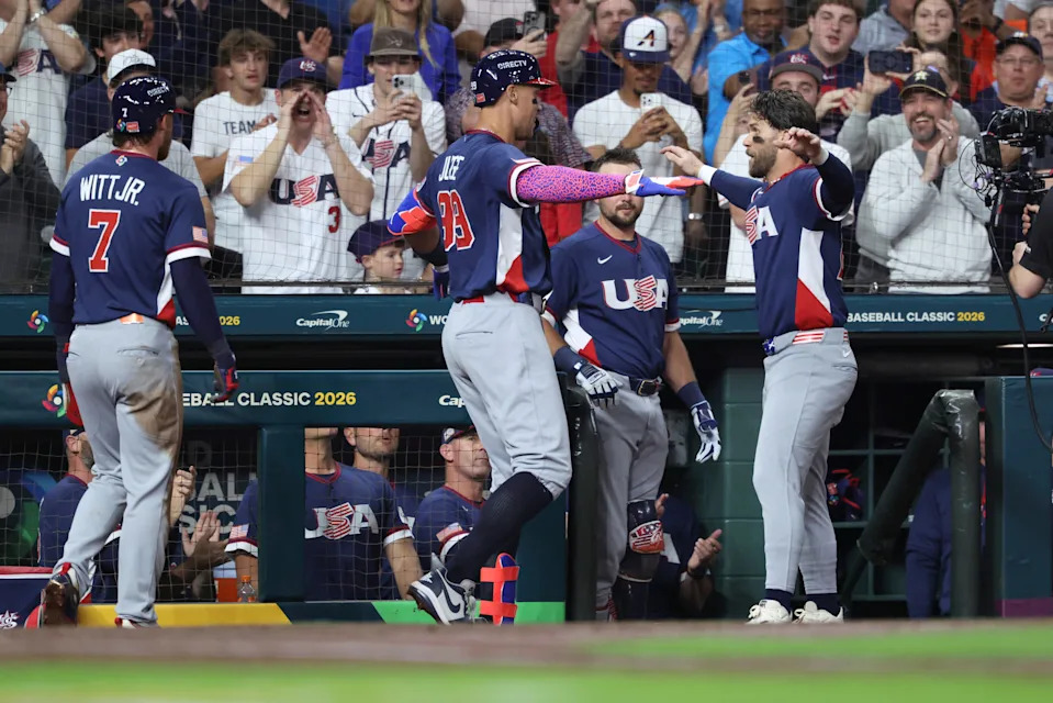 Mar 7, 2026; Houston, TX, United States; United States right fielder Aaron Judge (99) and center fielder Pete Crow-Armstrong (4) congratulate designated hitter Kyle Schwarber (12) after hitting a two-run home run against Great Britain during the fifth inning at Daikin Park. Mandatory Credit: Troy Taormina-Imagn Images