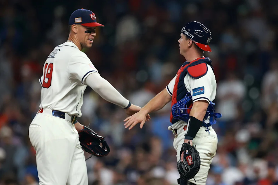 HOUSTON, TEXAS – MARCH 07: Aaron Judge #99 and Will Smith #16 of the United States celebrate after defeating Great Britain during the 2026 World Baseball Classic Pool B game between Great Britain and the United States at Daikin Park on March 07, 2026 in Houston, Texas. (Photo by Kenneth Richmond/Getty Images)